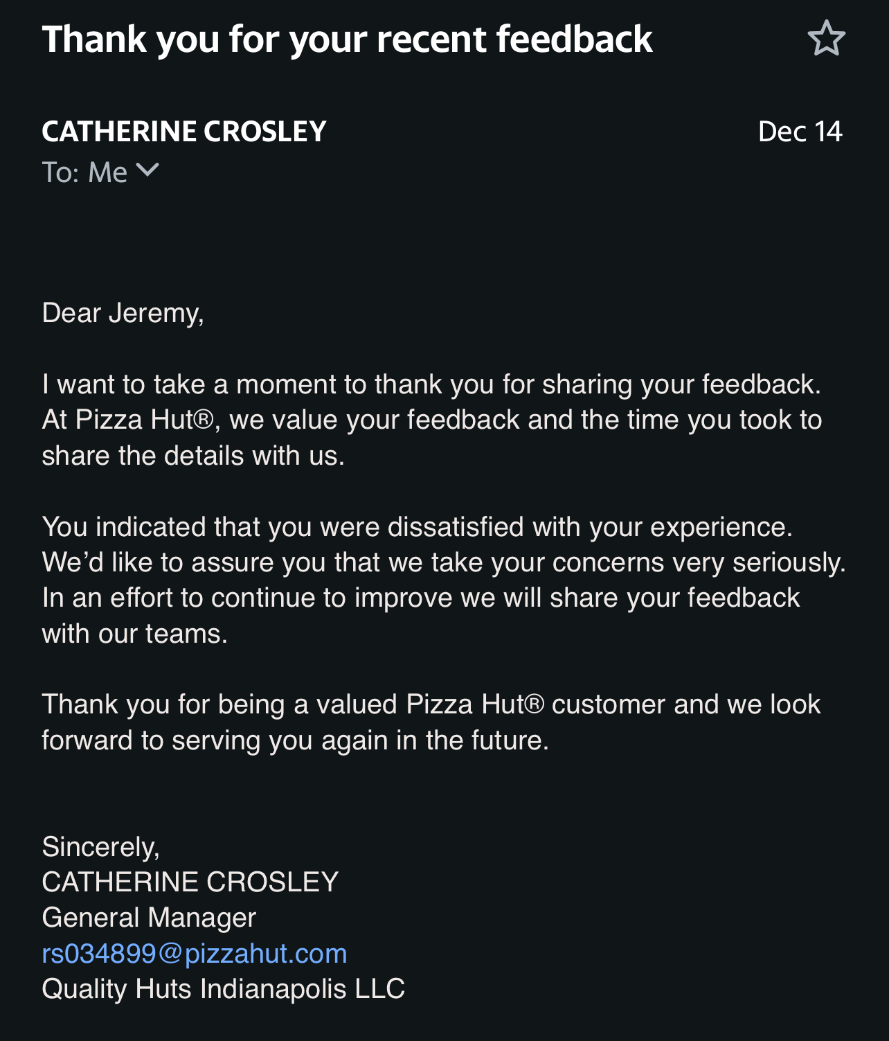 Read moreLastnight I ordered from here worst experience ( & I like Pizza Hut) and I’m leaving a review because they closed at 8pm for carry out I got my food at 8:45 Joshua brung my food to my vehicle for me. The staff refused to answer the phone for the rest of the night so I couldn’t even speak with anyone on behalf of my order! I ordered the big box and a pizza melt quality of the food was ridiculous. My wings weren’t cooked Thoroughly and they didn’t have hardly any sauce , they must be out of supplies because they put my wings in the pasta container which is aluminum, than the pizza was dry hardly any sauce and the dough tasted sour. Not to mention I ask for plain bread stick with no garlic seasoning and they contained garlic , ohhh and the melt was over cooked it’s was insane what I thought to be a nice dinner for the kiddos was horrible and I don’t appreciate it than to put the icing on the cake , I call Now the next day 12/4 just to be told by Justein that she can’t give me a refund I have to wait until Monday until Kat returns to work , so they expect me to hold on to this old nasty dry a** food until someone can rectify the situation this Is beyond horrible customer service!!! Also just so ownership can know the people that worked night shift for Saturday the 12/3/22 a few of the worker weren’t very clean looking , I notice nails were dirty uniform weren’t clean , and it was Not from making pizzas , those are the folks that represent your company!!! My order was carry out so I was physically inside the location, and I’m really upset because like I said they ruined my Saturday night with this bs food they provided me if I could give 0 stars I would have . I also called quality on behalf of this situation too. Crazy it takes two seconds for Pizza Hut to receive my money but now I’ll get the run arounds for 37$ refund . Pizza but def loss a customer today. I really hope ownership see’s this review. You need to get in there and make some adjustments because this is just bad...