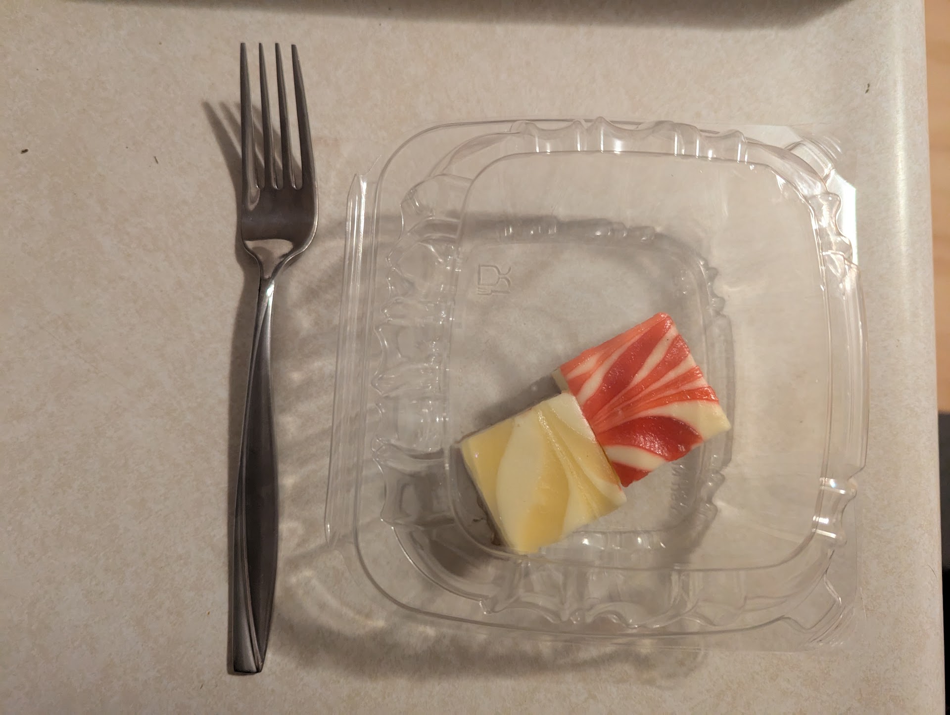 Problem 2: She asked him what kind of cheesecake we wanted and showed him a couple plastic containers, each containing two bite-sized cheesecake squares. When I saw what he brought home, I asked if they'd offered any actual slices of cheesecake, since that's what I'd ordered (and paid $4.99 +tax+tip for). He said no, he was only offered the containers with those little squares. For reference, they look like the one-bite cheesecake pieces that Costco sometimes sells in multipacks. Not NY style cheesecake. Not a "slice" of cheesecake. And for sure not worth the $5+ dollars they cost.