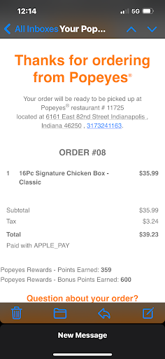 Read moreSo I stopped by on my way from work I’ve never been to the store and I’m never coming back. I walked in and ordered and sat down at 5:05. Nobody’s in the lobby. Nobody was in the drive-through when I walked in and I was told it was gonna be 12 minutes on chicken so at 25 after after two people had walked in after me and got their order I walked up and said I’m still waiting on mine the lady like what’s on your ticket she didn’t have a ticket. I ordered three pieces of classic chicken dark with macaroni and cheese so here I am still waiting on fried chicken because they never dropped it and I’m waiting on the macaroni and cheese, which is not ready either wow I’ve been here for 30 minutes. The first time I’m at the store. I’ve been to other Popeyes before and they are way better. I don’t know who owns the store, but you need to get in there and you need to hire some people in the back you wanna work cause I saw that girl up there working and nobody was talking to her And she was calling out. Where is my chicken? Where is this? Where’s that nobody’s answering you should be ashamed of yourself first time here never coming back again 35 minutes is way too long to wait when you’re the only and first one into the restaurant and I sat down in the lobby, where there was a girl out there cleaning but the tables were dirty and I’m like what are y’all doing? There’s no customers your lobbies dirty and thank God I didn’t ask for a pie and for waiting all that time you could’ve at least thrown in a biscuit or apologized, but I got neither and I thought God how long would I have to wait on...