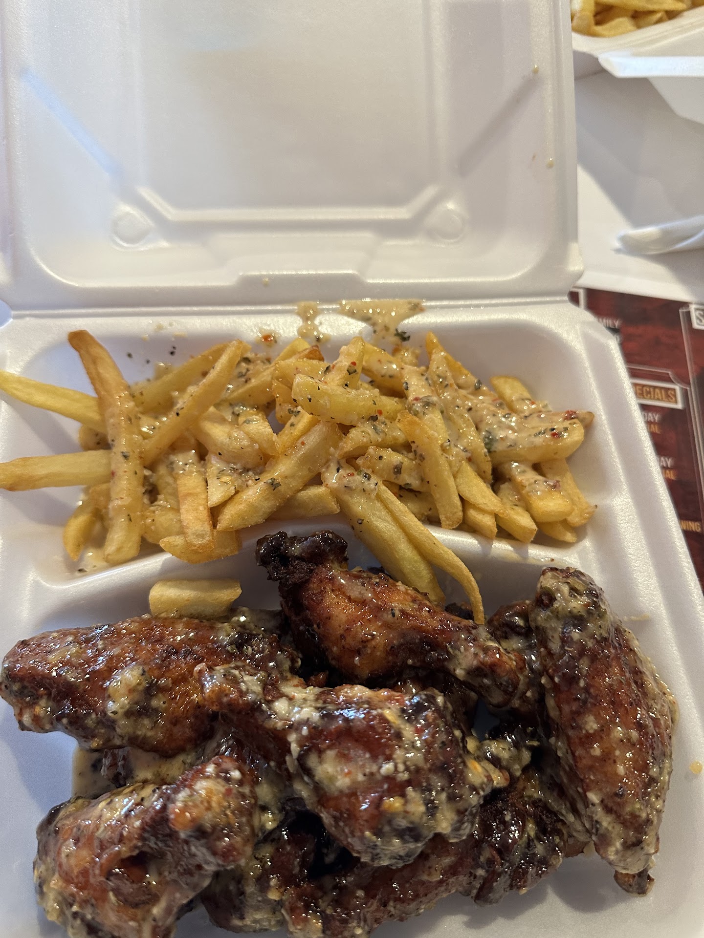 On top of that, the wings and other food were really good. I got hot habanero and mango habanero, and they were both delicious and pleasantly hot. My wife got a chicken wrap and said it was very good. My favorite was my fries topped with parmesan garlic sauce.