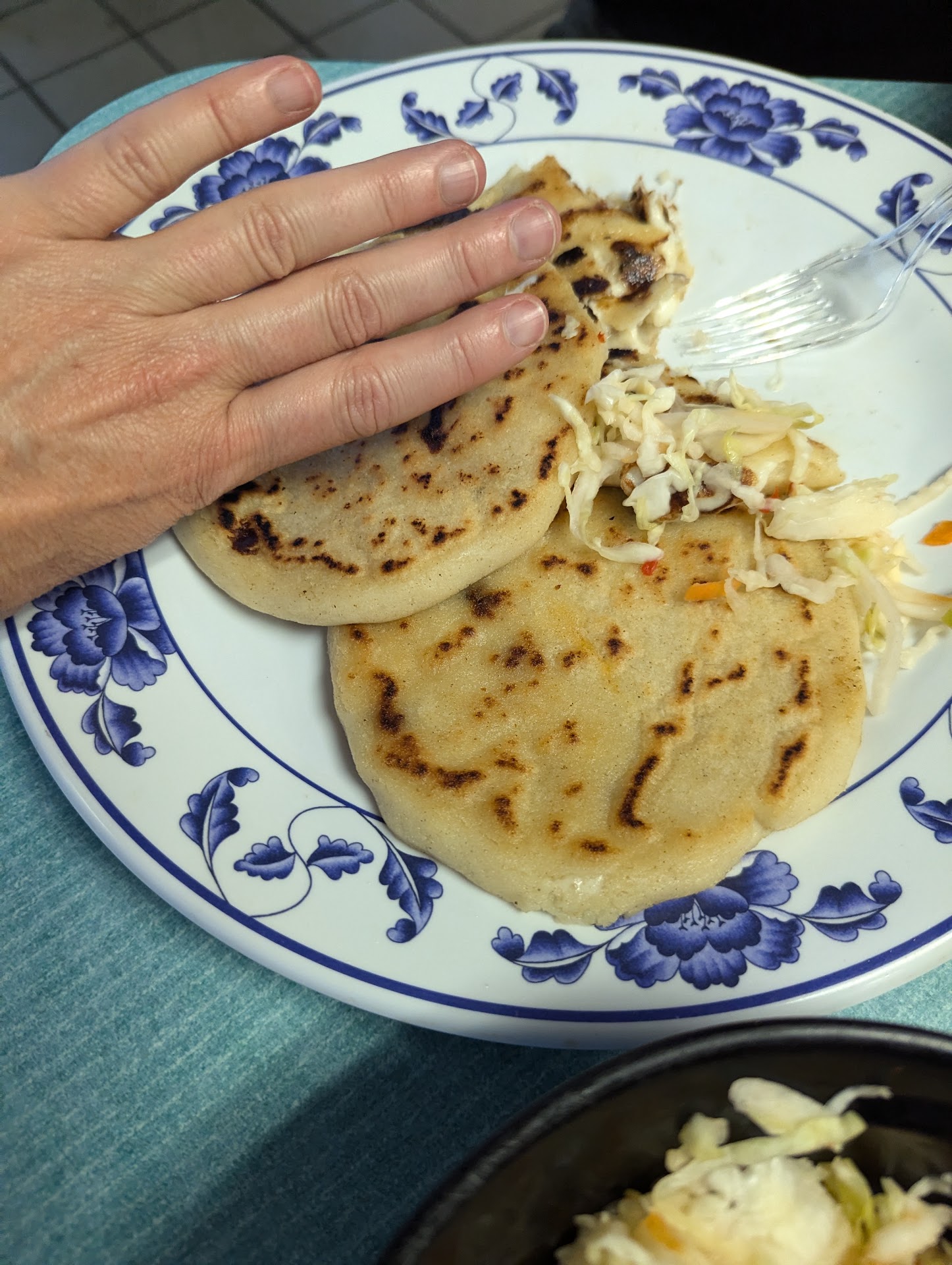 I wasn't impressed when I ate here in early 2023, but my opinion has changed drastically for the better. I think pupusas went from $2 to $3, but the chicharron con queso and chorizo con queso pupusas were much bigger than I remembered before: almost 24 ounces (1.5 lbs), each one. And delicious, too. And some seemingly good salad as a bonus (I hate all salad tbh.) You probably also get over 1½ lbs of rice for the $2 menu price; I liked this rice, having a bit of carrot and bell pepper taste.