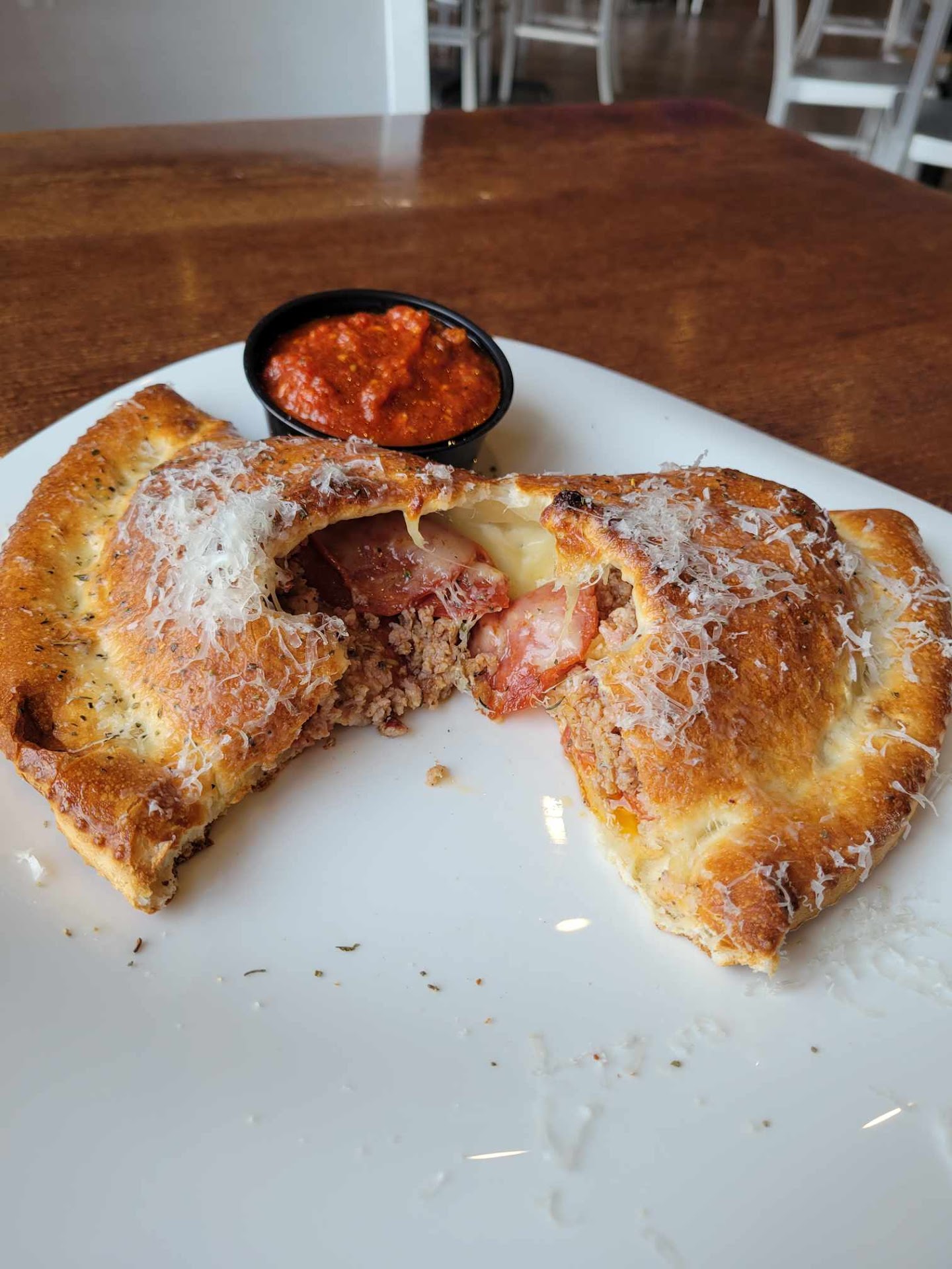 Read moreSuch a pretty space inside and decent location to hotels made this place stand out to us. The food tasted off. A friend and I ordered different things and when I tried to explain to a “server” that came over to ask how we were I handed the calzone my friend ate 3 bites of and explained she did not like, she told us she was really sorry. I had hopped she would offer us something else for the price which we paid but she didn’t .. no money back either. Sucked. We handed her the plate we just wasted money on. So we ordered something else, again such a let down, didn’t finish left it on table, got up left. You pay before you receive your food. The “pop” was disgusting, it was like flavored water that was flat… The best thing was the server coming to check on us and the restaurant looked clean and nice. Otherwise we could’ve saved money by not coming here, we will not be returning… we should have knew better when there was 3 ppl in the whole place…. Save...