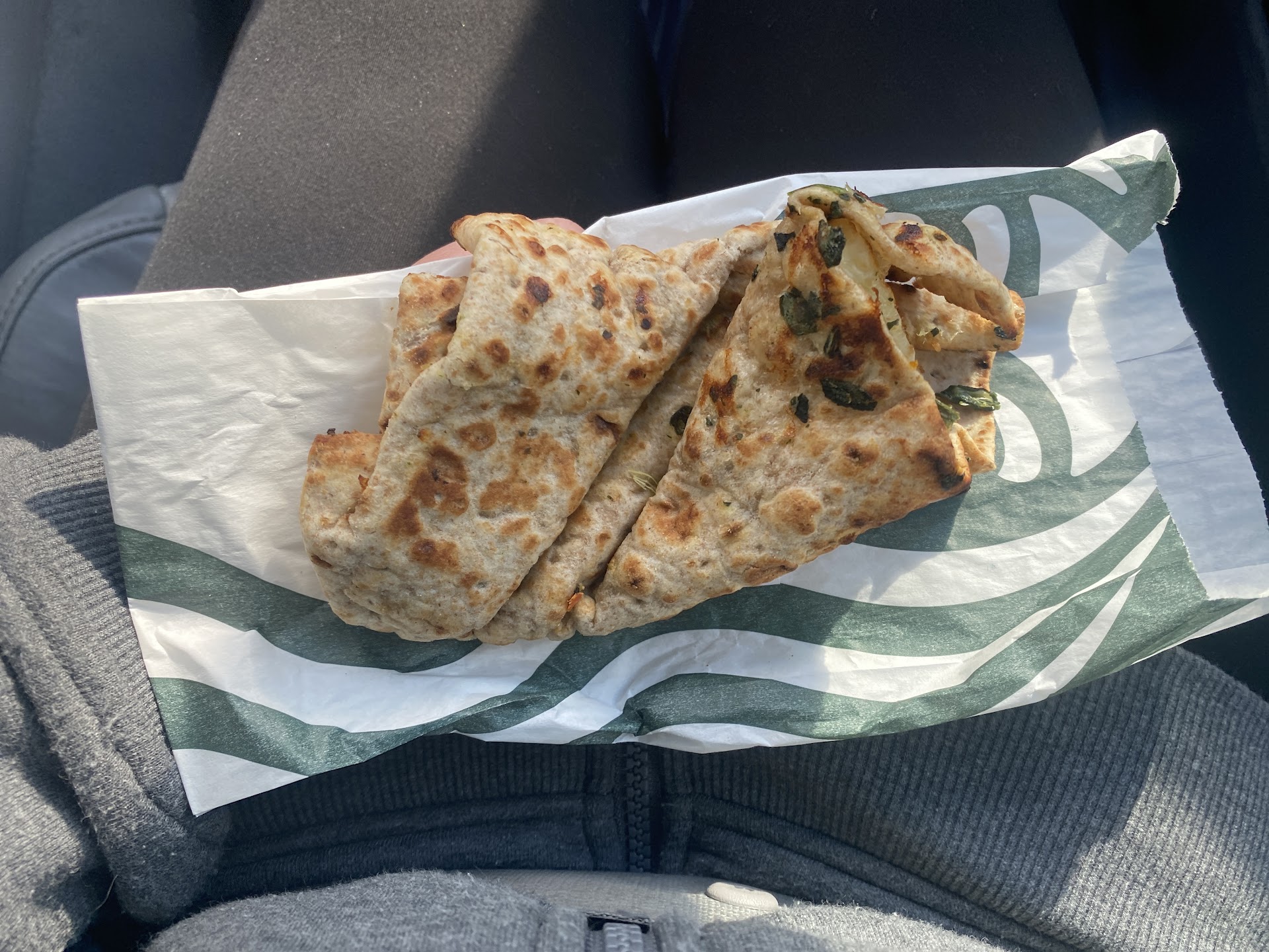 I have a go to order. Tall iced peppermint mocha with coconut milk and a sausage egg and cheese with no cheese. See, I can do the cheese but I don't take chances.