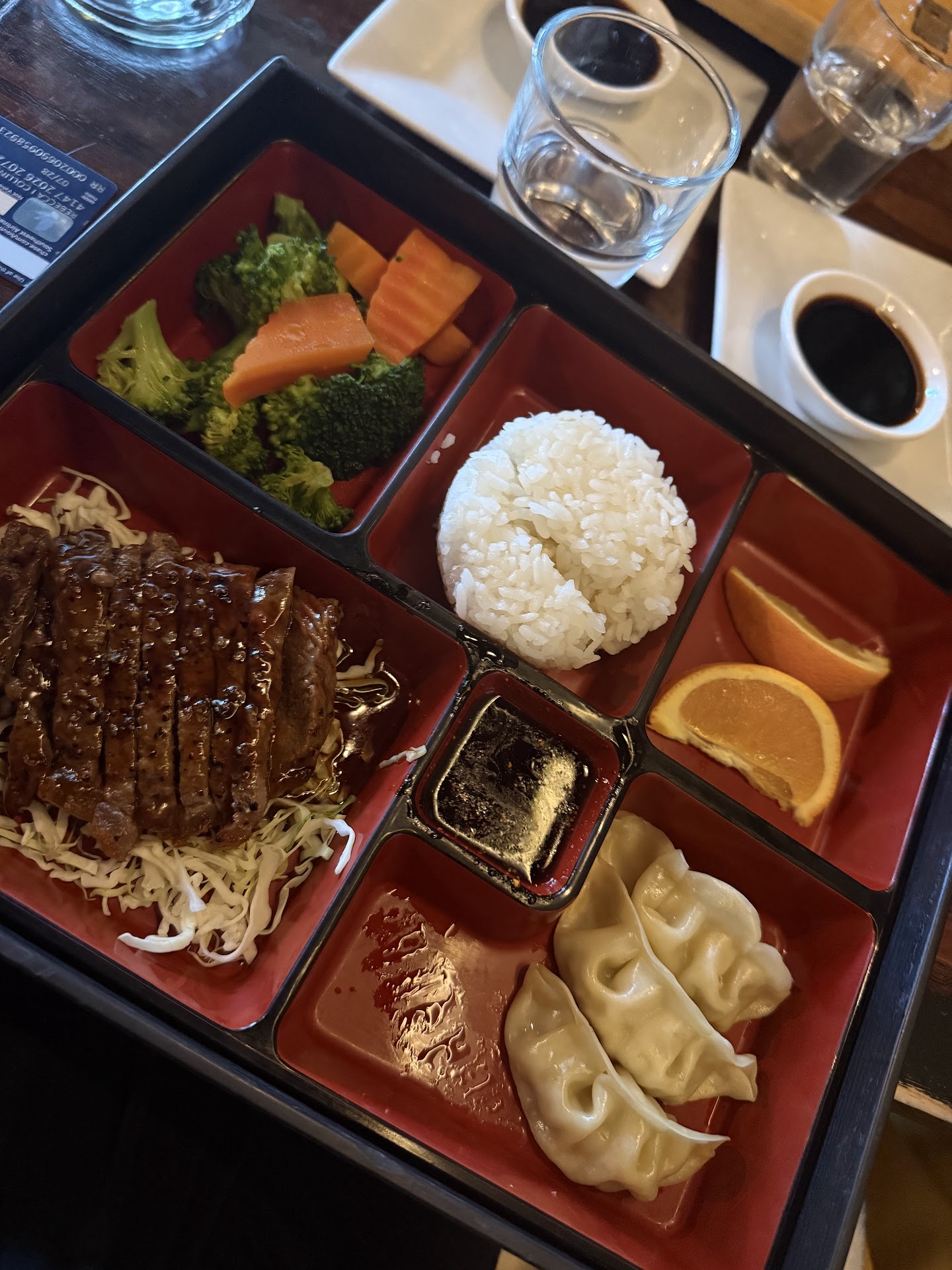 My wife and I were warmly greeted by a gentleman at the sushi bar, and the hostess. Our server was very attentive and made sure our drinks were filled and the food was served promptly. The Vegetable Spring Rolls were very flavorful, and the dipping sauce had a great flavor with enough heat on the back end to cause a tingling sensation on the lips. Unfortunately the rolls were far too crispy as was evidenced by the dark brown color. The Miso Soup was warm and flavorful, and complemented by the soft tofu. The sushi was very nicely plated and presented to us. The Tiger Eye Roll wasn't tightly wrapped and a bit sloppy to handle, and the inside roll wasn't as crispy as it normally is. The Crunchy Spicy Tuna Roll had a nice crispy crunchy crust that was just sufficient to the ratio of rice and tuna. The Dynamite Roll was spicy and flavorful, but had an off-putting taste that we were unable to identify. The Cherry Blossom Roll was...
