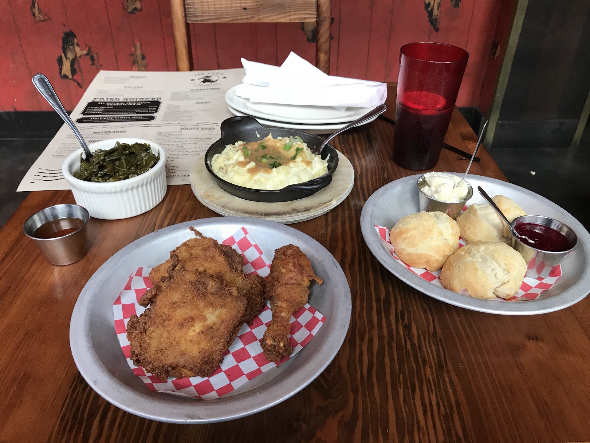 1/4 chicken dark meat (duh) which consisted of two thighs and a leg Horseradish mashed potatoes Collards Biscuits