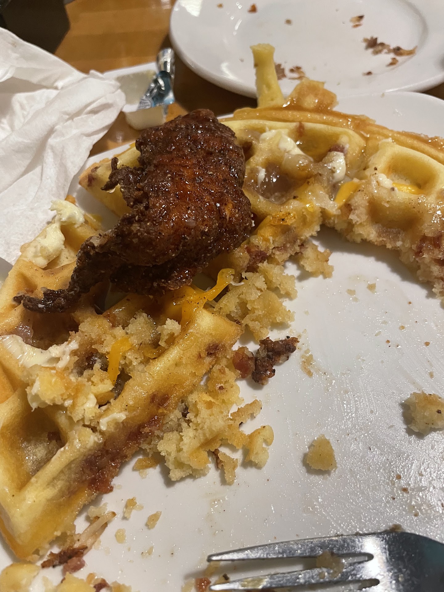 Myself and one other friend ordered the chicken and waffles. That particular dish was to come with cinnamon butter on it. As you may be able to tell from the pictures of the food below, it did not. So we asked for the cinnamon butter on the side. In the picture below, that’s not butter. The waffles was extremely dry, and the sausage I had was very hard. Not to mention, my friend got 3 chicken tenders on her waffle and I only got 2. For the mimosas we did order, our server went around and asked us which juice(pineapple, orange, or cranberry) we would like for the $40 bottle of wine we purchased. It turns out all 5 of us wanted pineapple. For 5 people, they only brought out 1 standard glass of juice for us all to share. For another glass of juice, they charged us extra. One friend had under cooked turkey sausage links, one ordered a build your own egg omelette with egg whites and fresh spinach that she didn’t eat, and the last friend had nothing to report on her food.
