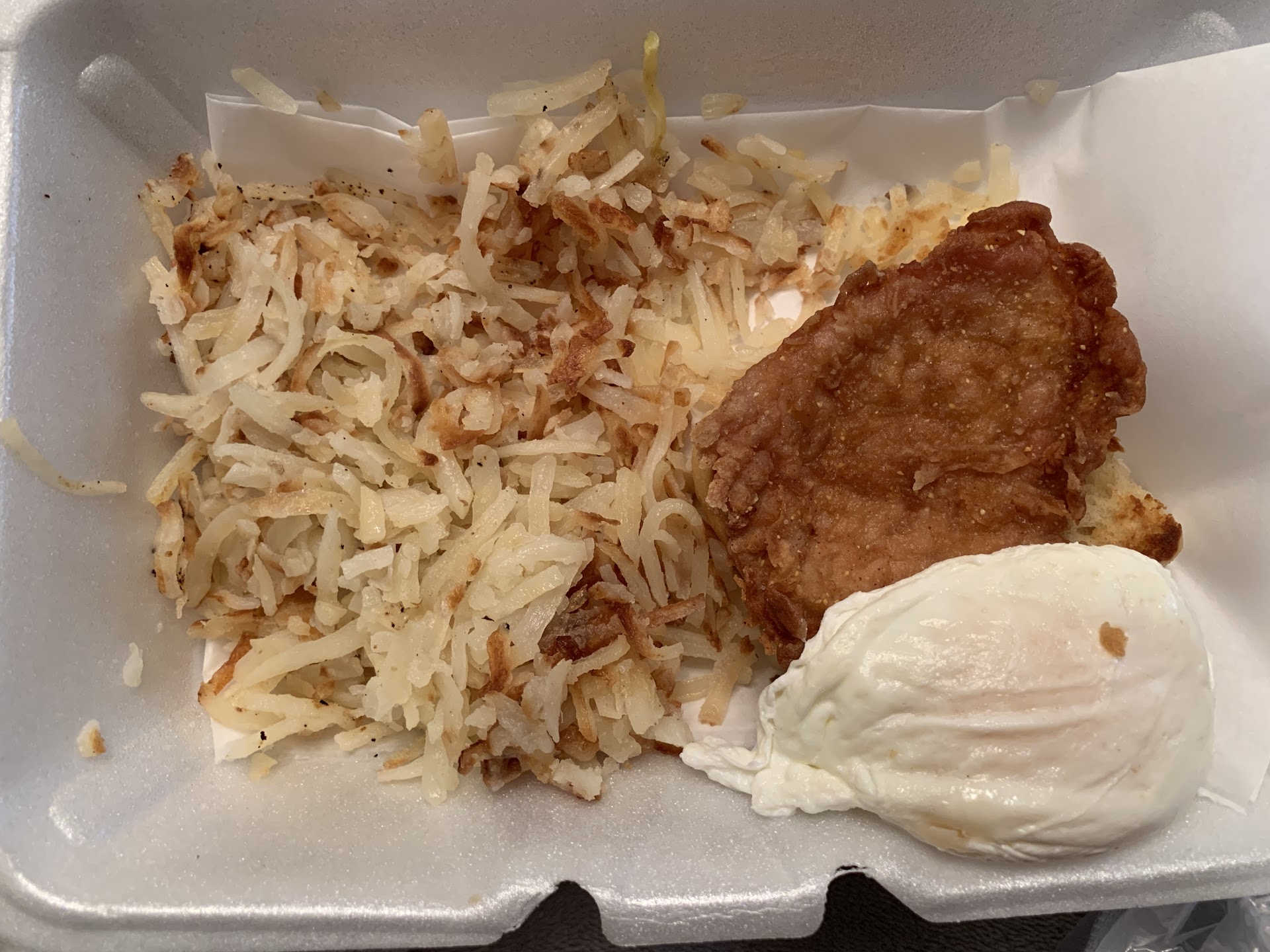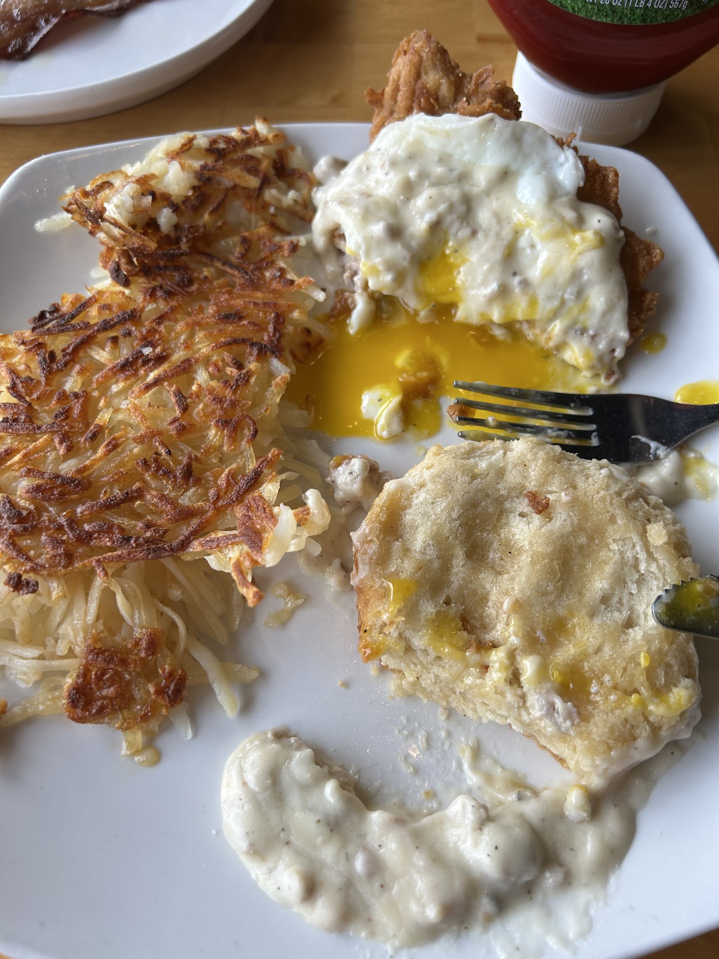 -cocktail was great no notes -tenderloin Benedict with biscuit and gravy seemed to have just been plopped on the equivalent of half a biscuit. Would have expected an open face biscuit with a large tenderloin pounded thin on top. Assuming that was one of their whole biscuits underneath, but other pictures don’t appear to be that way so idk I got. Picture shown is after I lifted the tenderloin/egg off the biscuit. The amount of gravy was dismal. I had to ration every bite and still barely had any for what it had to go with. the egg was over easy not medium as asked. -the well done hashbrowns look the same as every other picture, were dry/gritty tasting, and they don’t even bother to flip once to brown both sides That said, the tenderloin had a nice crisp/cook, the gravy tasted good, and the biscuit was fine. It was just overall disappointing in preparation and presentation.