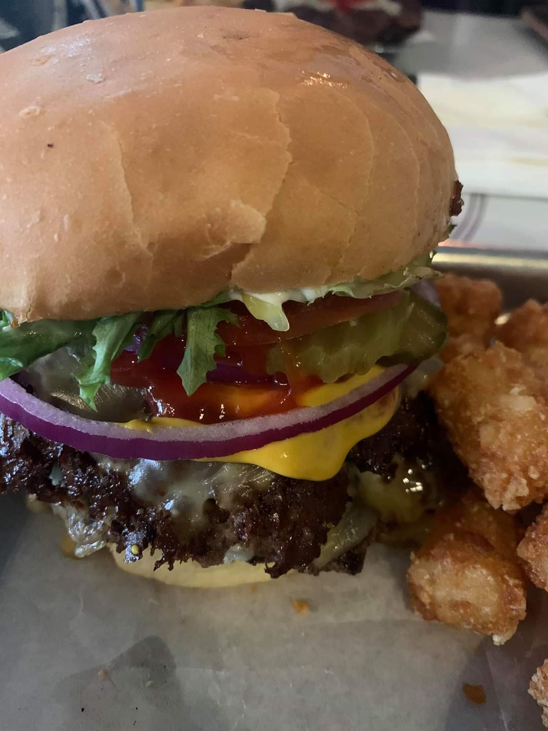 We grabbed a seat outside and enjoyed watching the place fill up as the day went on. Despite the crowd, our food and drinks came out fast and fresh. The burger? Easily one of the best I’ve ever had. The fries were impossible to stop eating—especially dipped in their homemade ranch (they offer several flavors!). The Hand-Dipped Chicken Fingers were equally tasty, and the portion was generous. Oh, and don’t miss the Bloody Mary's—they’re practically a meal on their own!