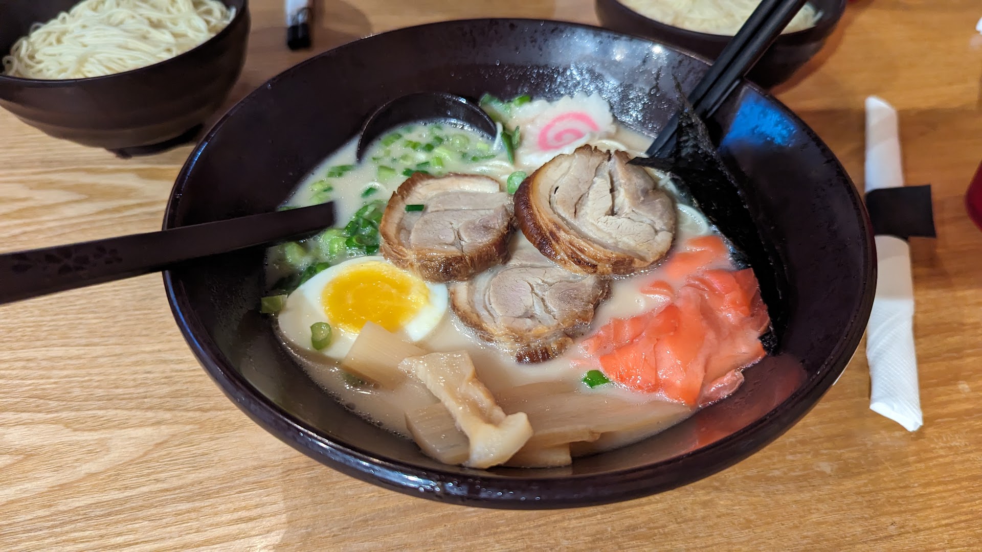 The food was aesthetically pleasing, but it did not taste as good. I had pork tonkotsu ramen, which should have a thick fatty broth. The broth was too thin and lacked the rich flavor profile I've come to expect from good ramen. It wasn't bad - it just wasn't that much better than the instant stuff you can buy at Costco. The noodles were stuck to each other, resulting in noodle clumps that couldn't be taken apart without significant effort. Another issue I had was the egg. The yolk was not runny and the egg was not marinated for the tamago flavor. It's not a key component to the ramen, but the lack of small details add up to a mediocre product.