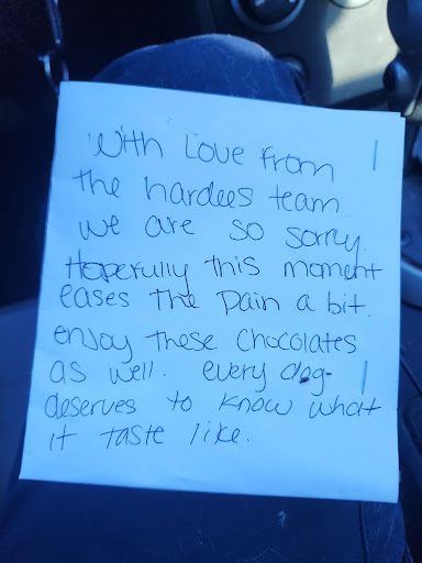 Thank you, Hardee's staff for making my dog's last meal. I ordered 2 cheeseburgers and a pup cup for my 9 year old black lab, Nakita. They were still on breakfast however they took the time to make fresh cheeseburgers for my companion, and wrote a note with it. I don't care what anyone says negative about this location. You were HUMANS, and gave me and my dog compassion, with genuine care during her last hour with us in this life. You wouldn't even accept my money for the burgers. Thank you. I hope all the people who have reviewed this location negatively over whatever lame junk they had to complain about sees this review. Once again, thank you. You made an incredibly hard day a little lighter on me, and I will always remember that. She also enjoyed trying the chocolates you gave us, for her first and last time. Words cannot truly express the love you showed us...