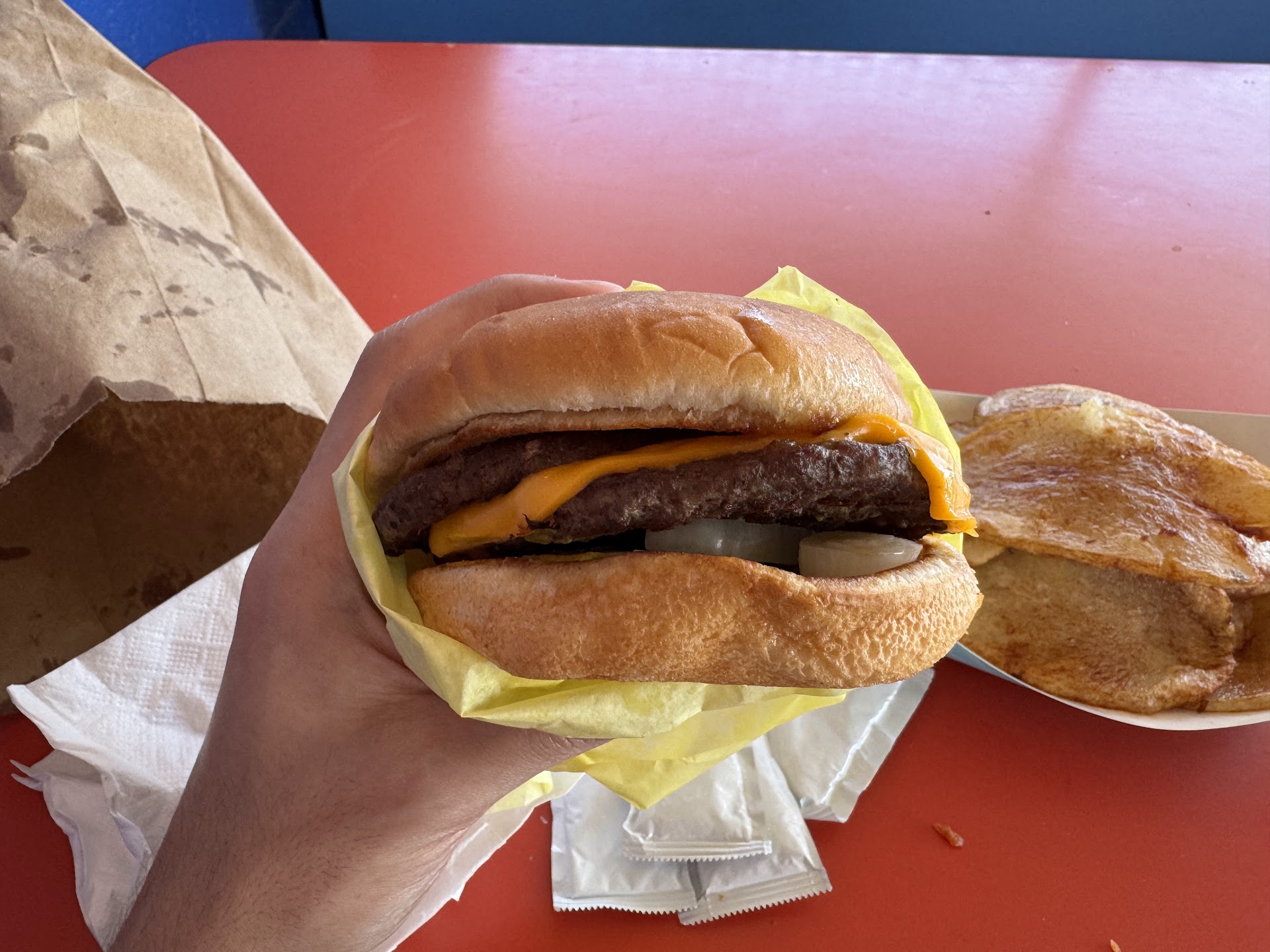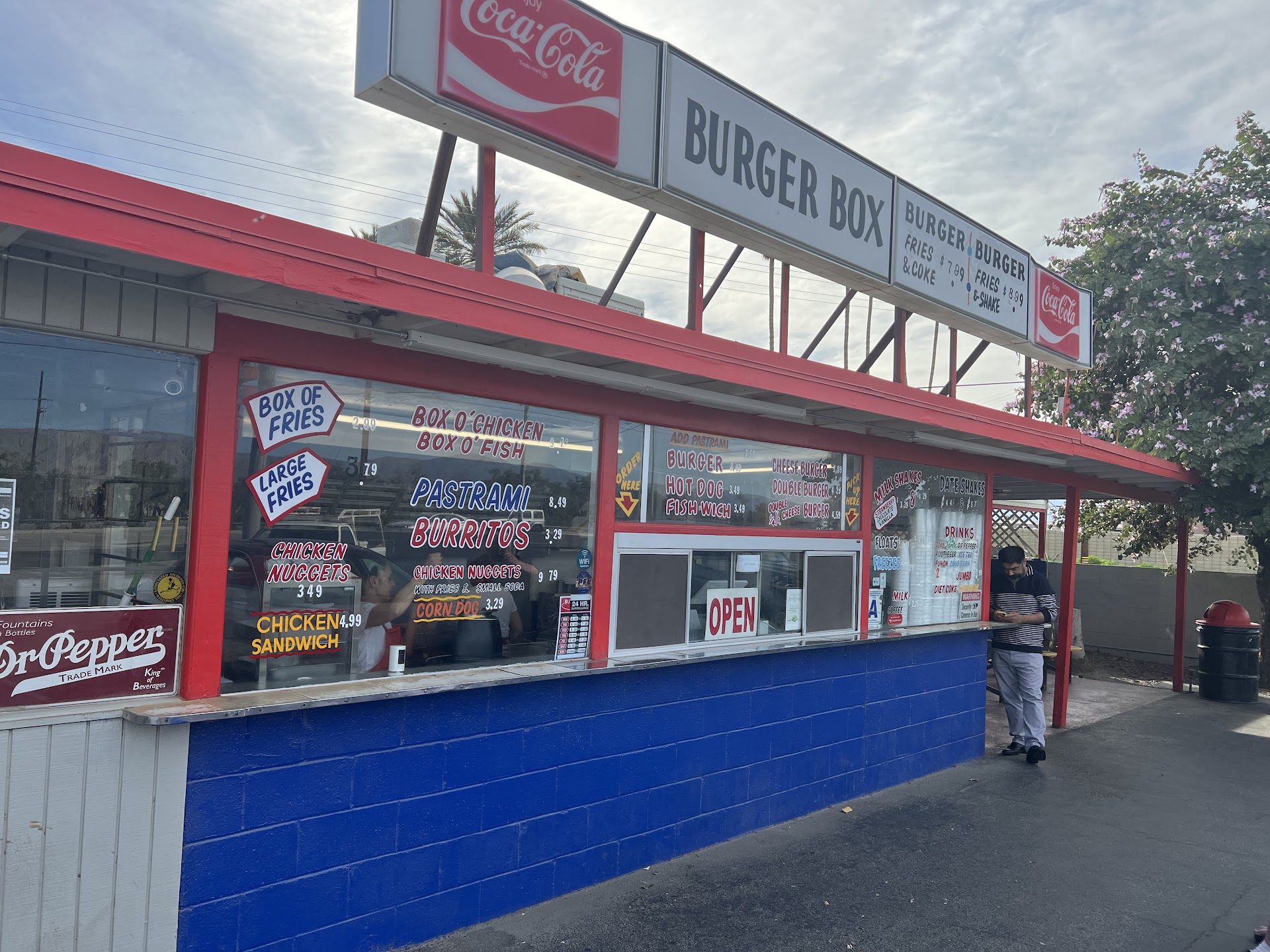 Burger Box has been in that location for as long as I can remember. There's no indoor seating and I think that makes this place unique. It gives it that authentic feel that you don't get at a McDonald's or Burger King. There is some benches and seats to the right, however, but it is outside. That doesn't bother me.