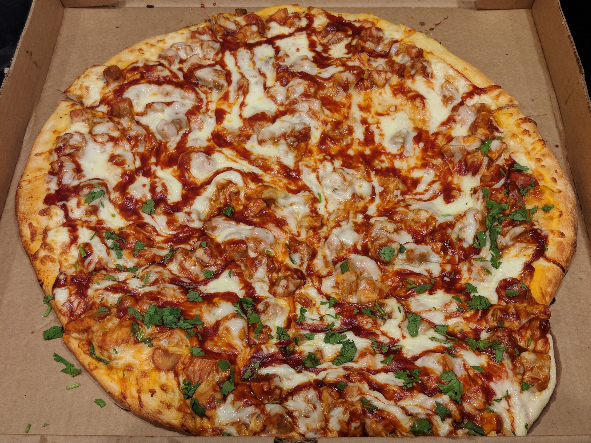 The large pizza was very large, I'd say I'd guess it was an extra large if I didn't know. Also, they were generous with the toppings, as there was lots of chicken on it. The crust is quite doughy & thick. The bbq sauce was just a little too sweet for me with the slightest tang. The crushed red peppers helped with that.