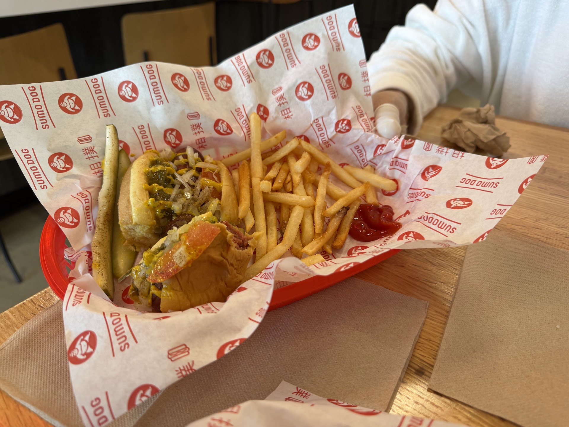 In the end we chose familarity over adventure and tried the Chicago Dog and New York Dog. With fries and one drink that came to over $22, which seems a bit expensive (see pro tip below). The food was brought to the table, served in a plastic basket.