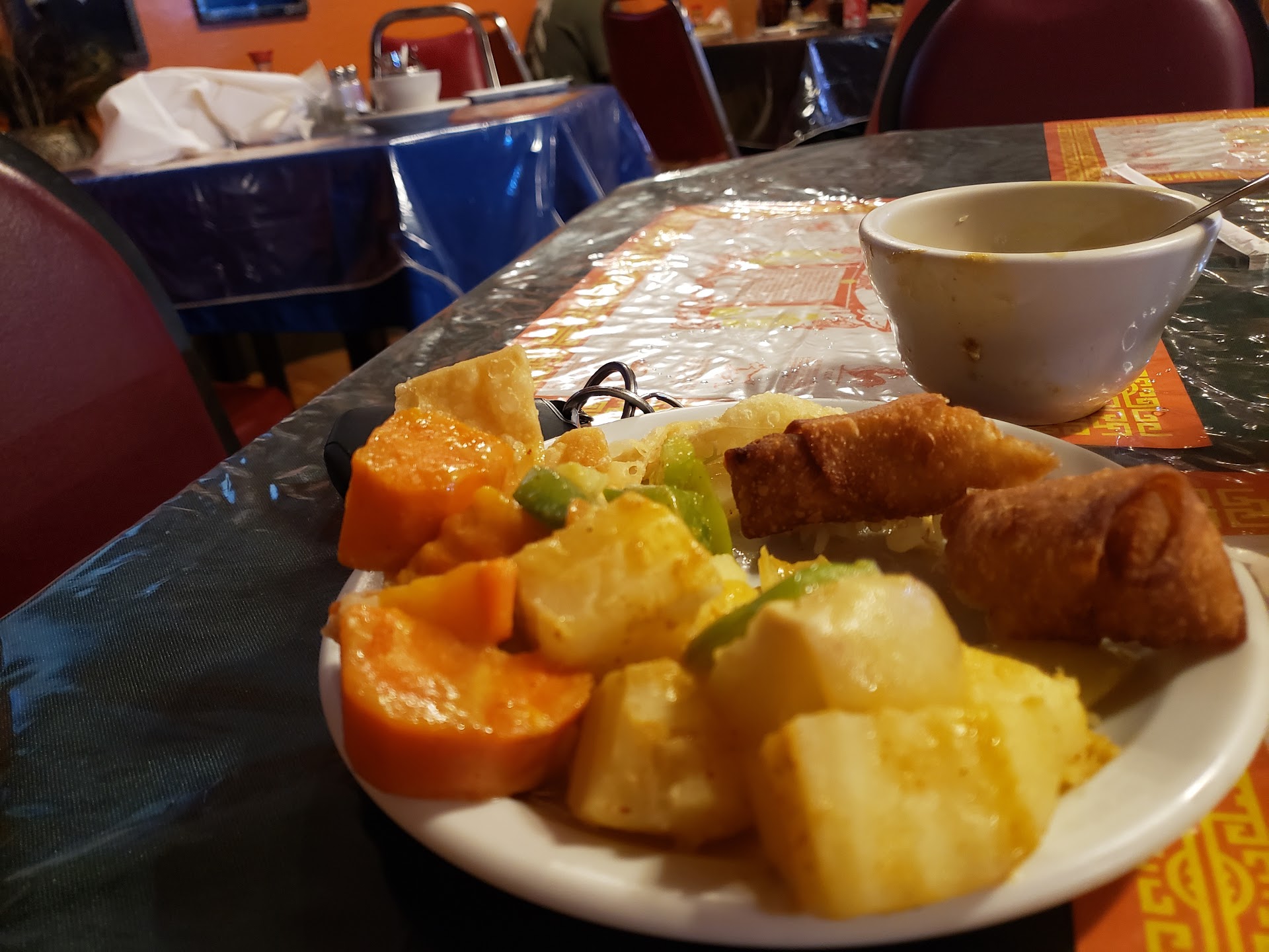 I haven't been the tis restaurant for over a year, and boy was I disappointed. I ordered the Chicken Curry and did notice a sign stating that if you wanted snow peas on an order, it would be $2 extra. That is insane. Usually they give you 2 or 3 on your plate, but I was warned, so that is not the point. The small lunch plate had a pile of thick cut, mushy carrots (1/2 to 3/4 thick) and large potatoes (about 3/4 in cubes) with 4 small pieces of bell pepper and some onion. The sauce itself was ok, but whoever decided on large chunky vegetables needs to re-think it. It was terrible. The egg roll was also not appealing. It smelled like it was cooked in very old grease, so I passed. I would love to say that the service made up for it, but it didn't. The waitress seemed rushed and brought steamed rice even though I asked for fried. I'm sorry to say that this restaurant is crossed off the list of places...