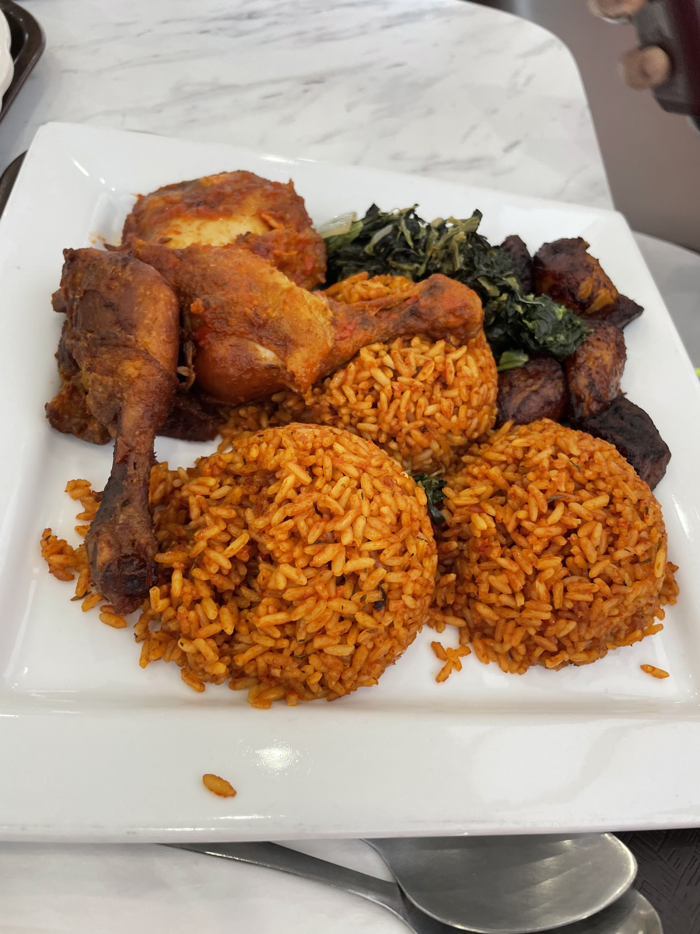 Their Jollof Rice Platter 5/5 - it’s sooo good! Not bland AT ALL, they season it to perfection and it also has that slight Smokey taste naija party rice has, it gives lifeeee lol it’s a good start for someone who wants to try Nigerian food for the first time, the chicken is also seasoned to perfection and the plantains are soft and succulent, the spinach on the side is okay, it’s a nice touch to the rice plate.