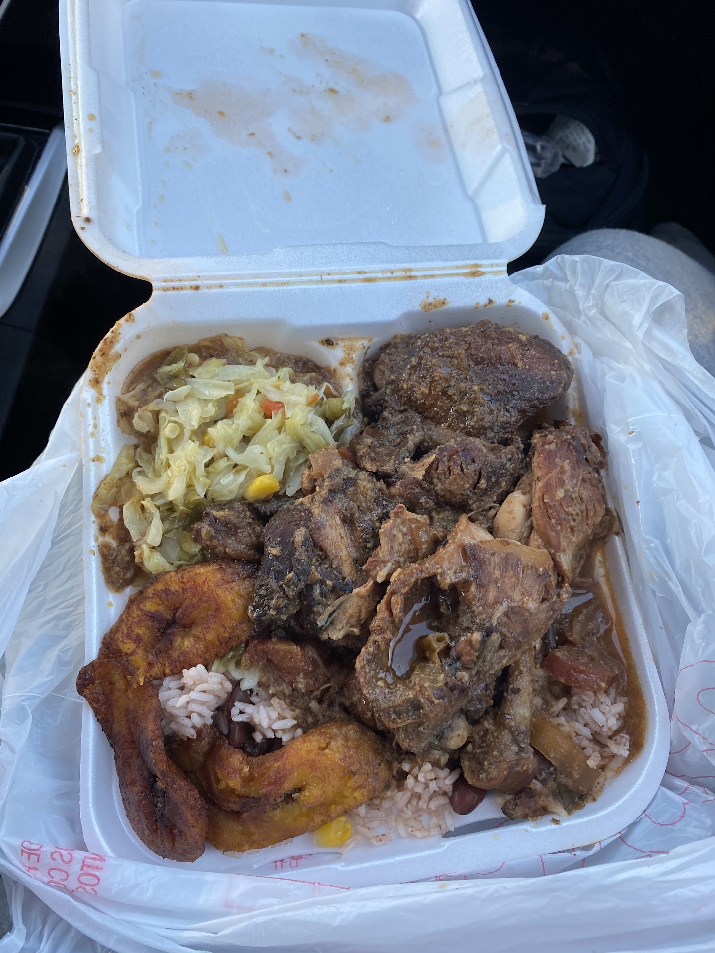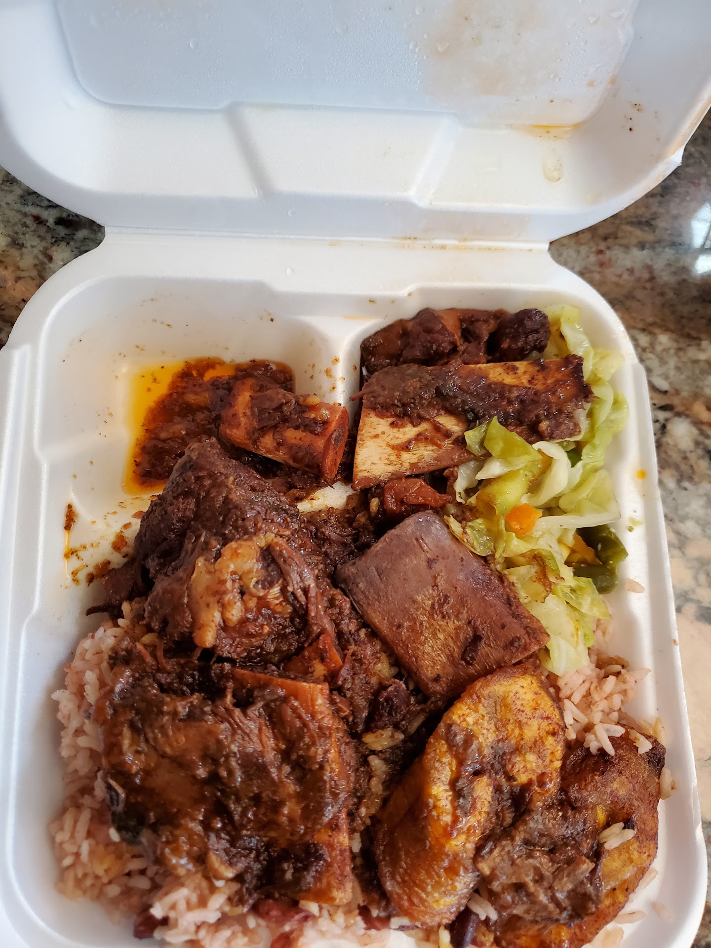 Anyway, I ordered the oxtails and the curry chicken. The oxtails were 🔥🔥🔥! Right amount of tenderness. Wasn't tough like I've had at other places. The curry chicken was a lil spicy tho! I always thought jerk chicken was spicy. Hence I order the curry. I've never had the curry so spicy before. The peas and rice was on point. As was the vegetables. Mainly cabbage and carrots. The only major food complaint was the plantains you could tell had been sitting there for a min. Lil overcooked. But I'm not a plantain fan so that didn't bother me.