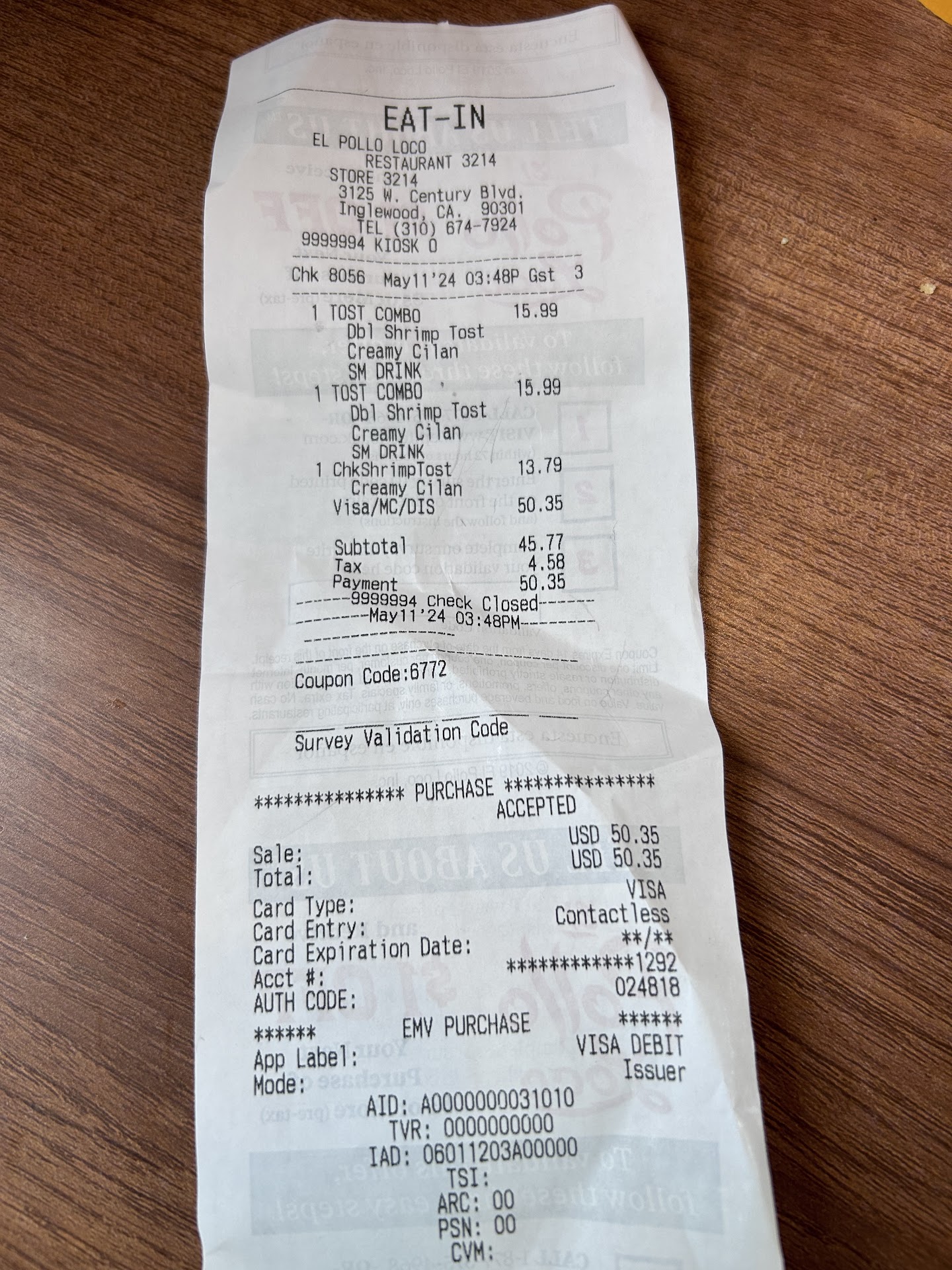 Read moreEsta cadena de restaurantes cada día va de mal en peor tanto en servicio calidad y precios fuimos ala locación de imperial y Normandie y nos salimos por que no había cajero y la persona que llegó no sabía usar el sistema que ahora tienen de pantallas además muchos desamparados adentro del lugar es incómodo y nada seguro,llegamos a esta locación de century y ordenamos en pantalla ya que si sabemos hacerlo,justo acaba de ordenar y pagar y sale una señora y dice ya no hay camarón viene la cajera y me dice sabe que ya no hay camarón si quiere las tostadas de pollo? Y ya teníamos mucha hambre y dijimos ok está bien tres tostadas doble de pollo, nos sentamos pero me di cuenta que la tostada de pollo es más barata que la de camarón y fui a decirles que me dieran mi reembolso ya que había pagado más, pero la chica me dijo o por eso le di una soda más por la diferencia de las tostadas,y le dije haber la soda yo no te la pedí ?!! Ella dijo lo siento tiene razón ,le dije pensé que la soda me la diste como una disculpa de que no había camarón,me dijo hablé con el manager ahorita viene,y cuando viene este tipo de mala cara despota!! Me dice que las tostadas de pollo que me dieron son más caras exactamente un dólar más cada una ósea los 3 miserables dólares que me tenía que regresar🤬 El punto es que no me regreso mi dinero que pague de más por algo que ellos tenían en venta me vendieron y al final me dijeron que ya no había!!! Espero esto lo lea algún superior o supervisor de la empresa Polo loco,no me e interesa comer gratis ni que me regalen nada y lo hice problema en el restaurante por dos cosas teníamos mucha hambre y otra eran 3 dólares pero de 1,2,3,4 y sabrá Dios cuánto más se están llenando la bolsa,pongan más atención a su restaurante por qué si se ve la falta de servicio e igualdad estoy casi segura que si hubiera sido un blanco o moreno le hubieran regalado la comida pero como solos latinos hay si no hacen nada los hispanos no tendremos el mismo trato en lugares como estos muy mal para nada...