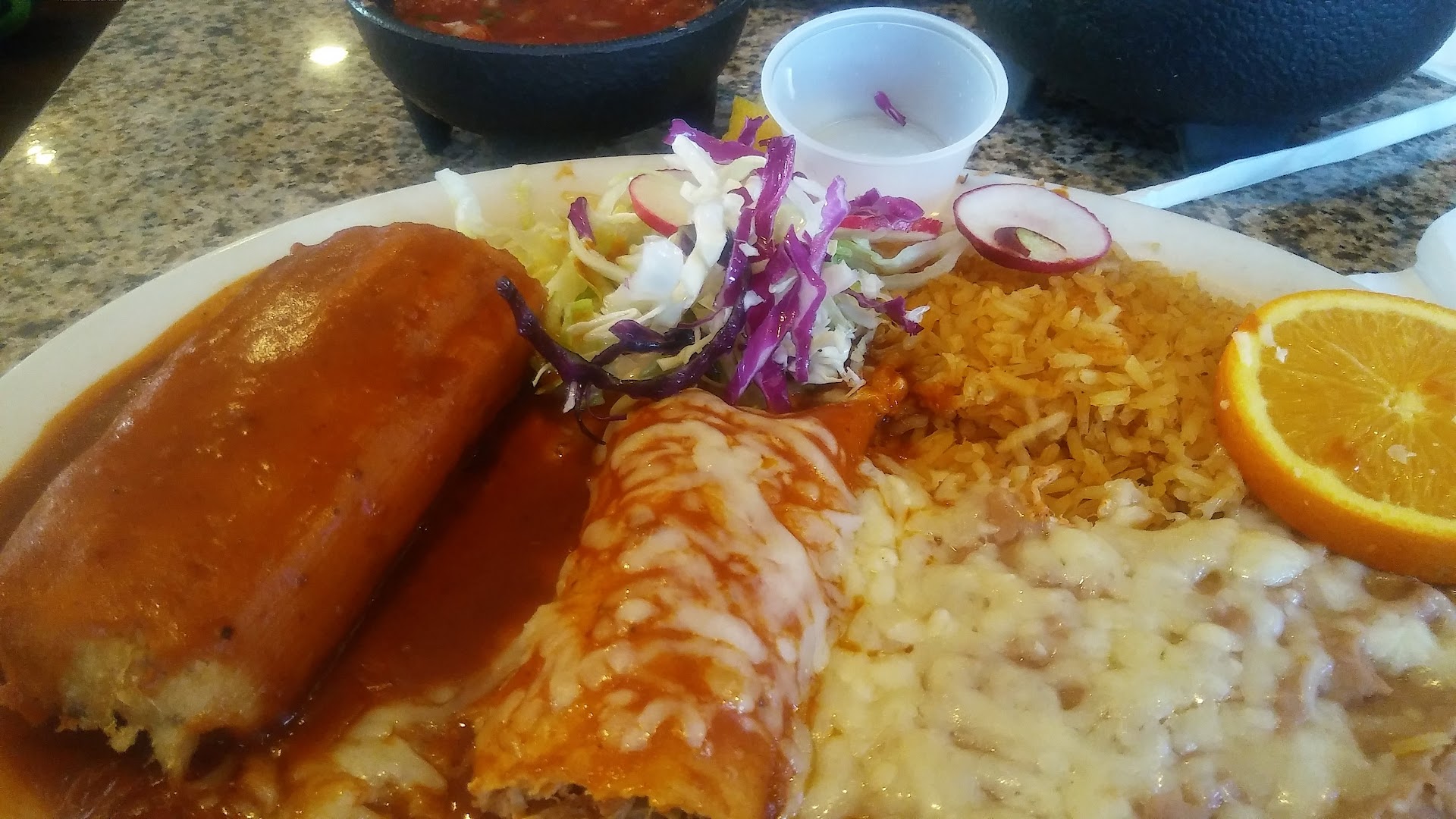 Read moreThe atmosphere was def festive, but I think restaurant owners or managers packed too many seats and tables for the configurations of the space. It felt so overcrowded and the noise (between the talking patrons and the BLARING music) made my dinning experience very unpleasant. The volume at which they played the music and the crowded space would be more appropriate for a night club, not a dine-in restaurant. They really ought to consider taking out a few tables to open up the space more, because it felt like a sardine can the way they had it arranged. They have a DJ booth and bar area, which are nice but it didn't seem like they accounted for that when setting seating and table arrangements. Now on to the food. Low in quality, flavor and freshness. I ordered a combo plate (tamal and enchilada with a side of rice, beans and additional side of cabbage). The presentation was okay, but they forgot to bring out my additional side of cabbage, which the waiter then brought out in a condiment cup, AND ONLY after I brought it to his attention. I was surprised that he brought it out in a condiment ("sample-size") cup because I specifically asked for a side, not a sample of. I expressed this to the waiter and he dismissed this fact and said he wouldn't charge me for it. That was nice of him but I would've rather he told me they ran out of something than to bring something out that was inconsistent with my order. There after, I decided to try my food out and noticed the tamal was EXTREMELY DRY along with the rice. The only things that were edible were the refried beans and the enchilada, but overall very MEDIOCORE. The food had the quality of "buffet food" as in the food was probably mass produced or purchased from a factory and prepared a day or hrs earlier, then set out on hot/warming trays to keep it warm enough to be served to its restaurant patrons. Local and visiting (out of state) patrons should be served much better food than what I had that day. I relunctantly paid for my food and jetted out of there. I really try to support local restaurants, vendors, etc, but in this instance I was gravely dissapointed. I will not be returning to this establishment...