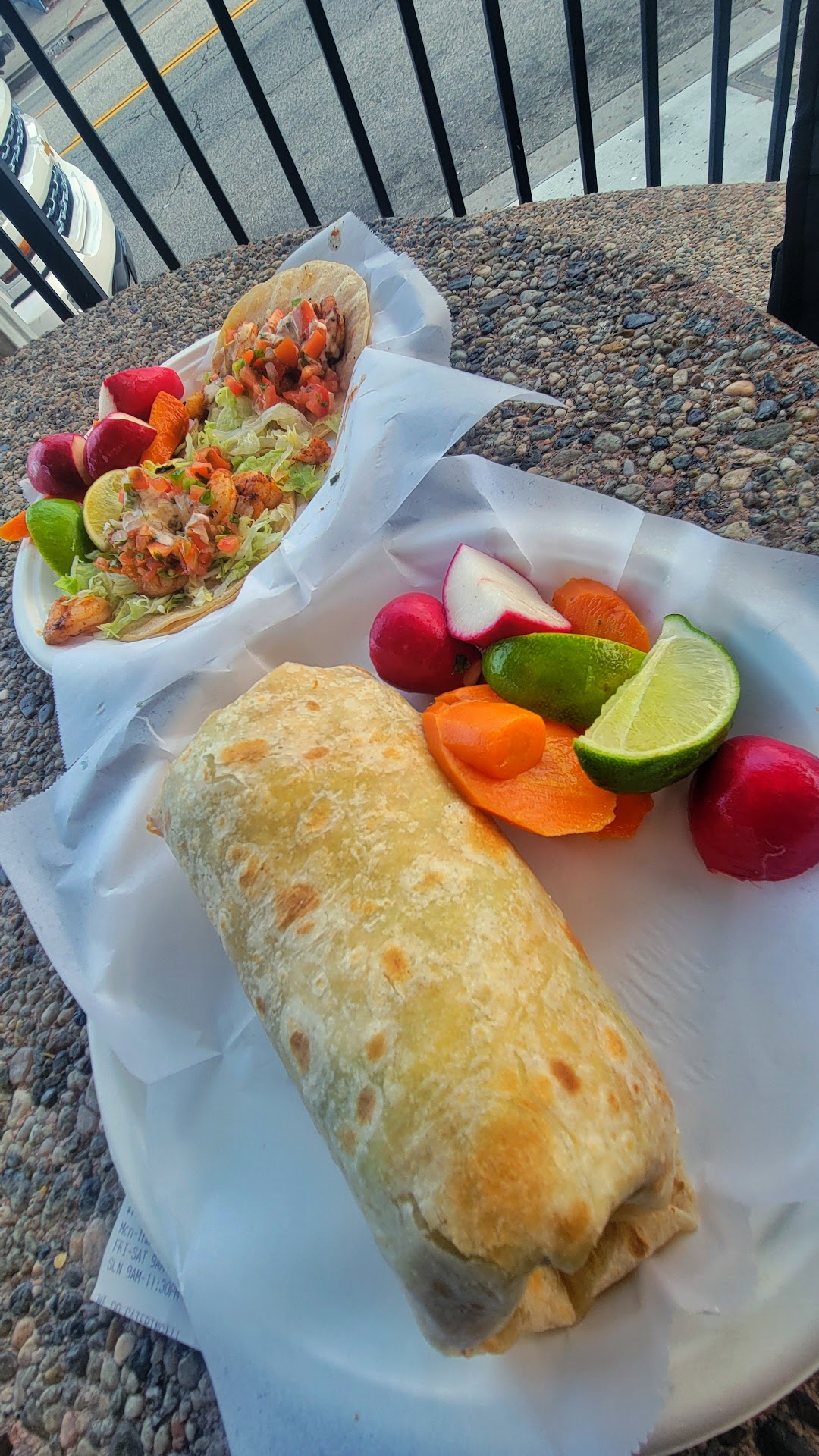 Read moreI stopped in yesterday for 2 shrimp burritos but almost let the bad reviews stop me. I am sure glad that I didn't let the bad reviews stop me. The atmosphere was cool, calm, and overall pretty dope/awesome. It was clean and well shaded if you want to eat outside in the front of the restaurant. The service was great and pretty quick preparing my order. Placing the order was fairly quick and easy as well. I received everything that I ordered in a timely and well packed manner. The food, shrimp burritos, were delicious and came with salsla and a bag of carrots, limes and radishes. I loved the flavor of the salsa with the limes. The seasoning of the shrimp was on point as well. Overall, the food was so good that I stopped again today to get tacos along with the burrito. If you have the time to stop by for a bite to eat, just got off of a flight, or are in the area; stop in and order something off the menu that might tickle your taste buds. Next up for me to try is the california burrito. Keep making the great food Lax Tacos. See ya soon and hope to see you that is reading this there as well. One! As in onelove. Update: returned for a shrimp burrito and 2 shrimp tacos an decided to take a photo and post it to this review. I can say that theast of the food and the preparation is consistent. Probably the reason I am a repeat customer. If you ate in the area, give them a try and hopefully you will become a repeat...