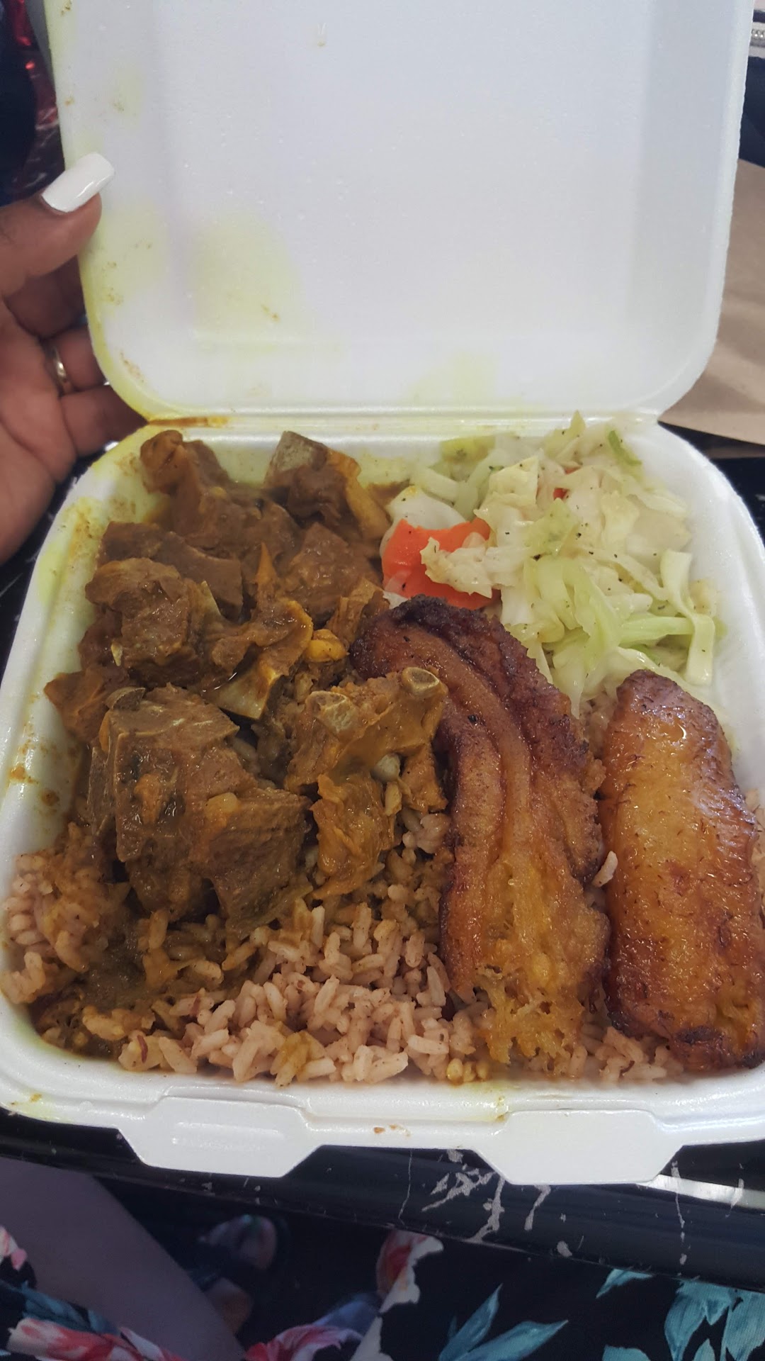 Read moreGreat food. Ordered large plate of Oxtail and a large plate of Jerk Chicken. Plates come with Black Beans / Rice mixed together and side of fried plantains and cooked cabbage. That Oxtail was so tender! Jerk chicken had right amount of heat. I also ordered beef Jamaican patty. It was not tough and salty very delicious. Had Champaagne Kola which was nice and cold. Also ordered a pineapple ginger drink. I have never tasted such a delicious drink before. The ginger has a big bite, but the sweetness of the pineapple keeps you coming back for more. I felt really good after the meal not sleepy or bloated which is a good sign of well prepared food. The locals are welcoming and provide great recommendations. Many inside have been coming for years. Let hope it stays that way they are right across the street from the newly built Rams...
