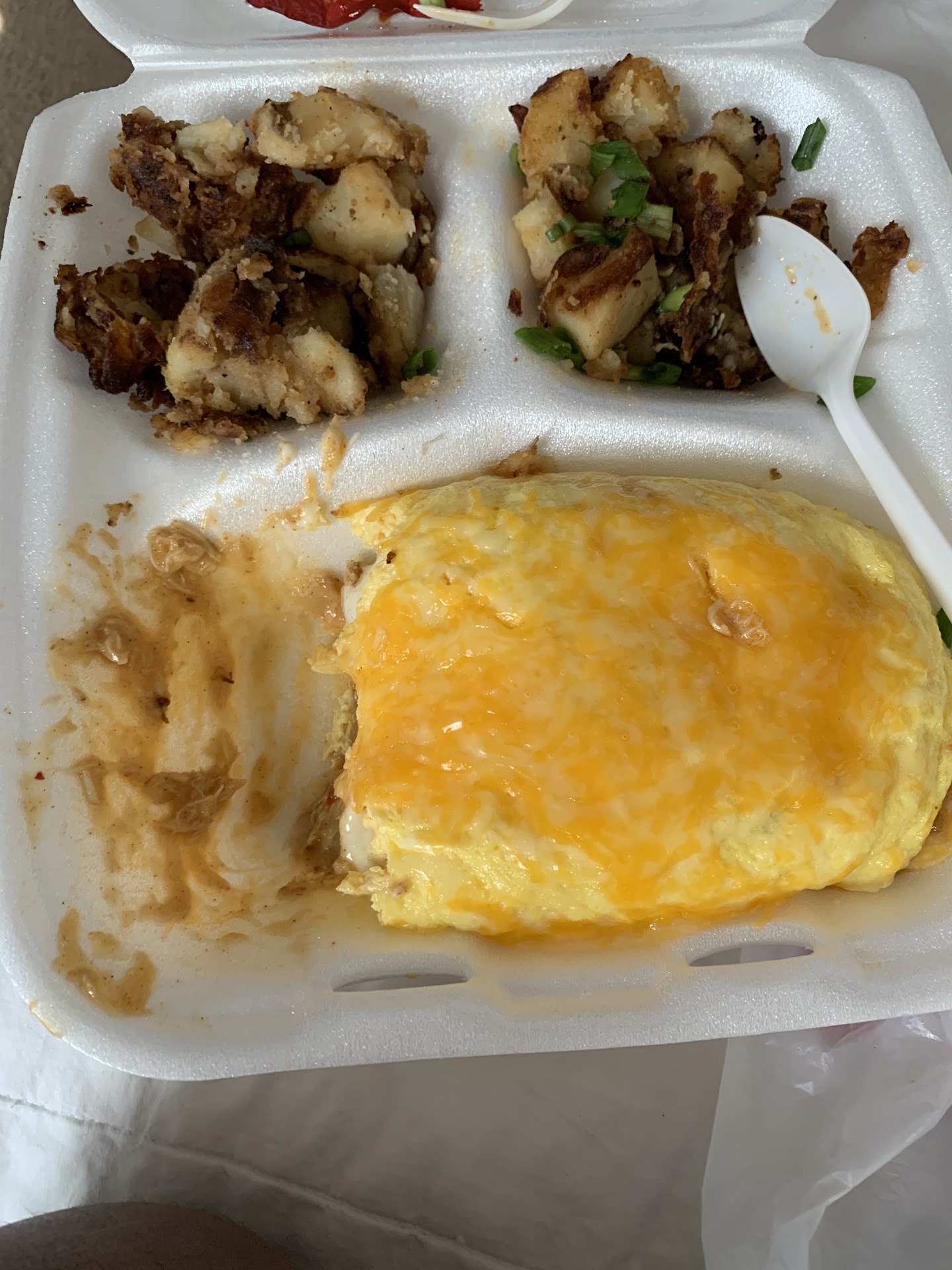 Okay now let’s get to the food! My plate slid while driving and I just KNEW there would be a mess when I got home BUT when I opened my bag everything was perfectly in place because of the simple hack they used and I was extremely appreciative of that I immediately went to yelp to leave a review... then I opened my food which was wrapped in plastic wrap so it wouldn’t open or leak 😍 and devoured my food for 5 minutes straight!!! The food is D E L I C I O U S and not just I’m starving this will do delicious.. it was I have to try dinner from there because this breakfast is bomb.com delicious. I ordered the loaded potatoes with the works 🤯😍 and a side of wings!! You won’t be disappointed at all!!!