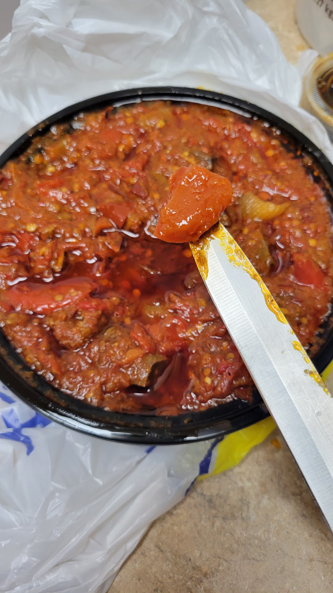 The ofada stew tastes nothing like ofada stew. Ofada stew is made with red bell pepper but this one tastes like tomato that is not properly fried. From my picture you can see a chunk of fresh tomatoes that is not properly fried. What does fresh tomatoes has to do in ofada stew? 👎👎