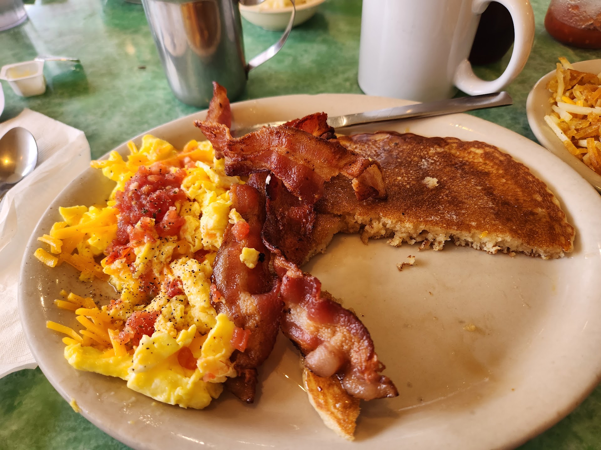 What an unexpectedly delightful treat! A friend and I ate breakfast here for the first time. The Cafe atmosphere was comfortable and welcoming. We arrived at around 9:30am and my first impression was the stack of coffee cups that showed the priorities of the place. I loved it! We seated ourselves at a window table overlooking a clean, small swimming pool. Our server greeted us promptly for our drink order. The coffee was delicious and served with milk from a small metal pitcher. I loved it! The menu had a wide variety of delicious-looking foods. I ordered the Denver omelet with hashbrowns, biscuit and a side of gravy. The server asked if I wanted a half or whole omelet. She recommended the half and I went with that and a good thing I did! When she brought our food, the half omelet took up over half the large plate! It was filled with ham chunks and crunchy pieces of fresh peppers and onions. I loved it! The hashbrowns were cooked to a crispy perfection, and the biscuit and homestyle cream gravy were equally delicious. I highly recommend this eatery to anyone who enjoys hot, homestyle cooking, especially breakfast. I am determined to come again to savor the other tempting items on their menu. And the price is...