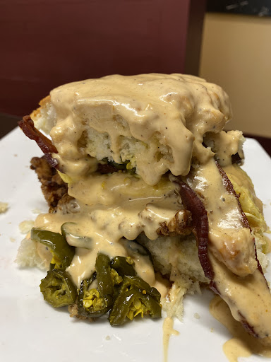 ordered Togo. The biscuit doughnut holes had been overcooked and left sitting in grease. Didn’t even try them the look and smell was so bad. Jalapeno cheese grits had an odd texture. Assuming it’s from the massive amount of cream cheese they added in and the taste of jalapeno was non existent. Last but not least and probably the worst was the frenchie. The biscuit French toast tasted like burnt grease had too much grease to eat and I ordered the chicken on the side for my dogs. They wouldn’t eat it.