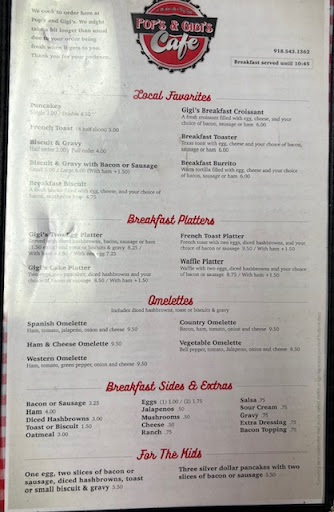 I love good small-town cafes. Unfortunately, Pop’s & Gigi’s was a very disappointing breakfast experience for me. Far from the 4.6-star rating on Google Yeah, those burgers and fries look good on Google and their Face Book page. Breakfast, well? The clues were right in front of my eyes. I just got dazzled by the burger and ignored the obvious. Almost completely absent in all of the pictures are any kind of breakfast. Looking back, I found only one sad looking picture of a biscuit and gravy in a to go box. There were no reviews for the breakfast meals. I’m slipping. I am usually much more diligent vetting a restaurant and seldom fooled. Not this time. The positive, the food is reasonably priced, the owner is friendly, the service is adequate and for some reason we got free coffee. All that doesn’t make Pop’s & Gigi’s a good place to eat breakfast. Noticeable when we walked in; plates still on the tables, some food on the floor from the breakfast crowd; a little grungy feeling. The interior is small. Heavily decorated walls, a cluttered Hobby Lobby looking decor. This is where small town working people come to eat. Don’t expect pristine accommodations. I can live with that. Biscuits, gravy and sausage patties for me. The sausage patties were small, pressed thin on the grill and burned charcoal black on the bottom side. Biscuits and gravy; fair. My wife had the French Toast Platter: two eggs, French toast, diced potatoes and bacon (supposedly,) check the picture. Eggs and French toast acceptable. The diced potatoes not good. Seem to have been cooked earlier in the morning and reheated. And NO BACON. The community seems to love Pop’s & GiGi’s for burgers, fries and lunch. The food that has earned them their 4.6-star rating. Stick with that part of the menu. Avoid breakfast. In other news: Did you know that Inola is known as "The Hay Capital of The World." A reputation the area has earned because of the high quality of Bluestem Prairie hay grown and baled in the many surrounding hay fields