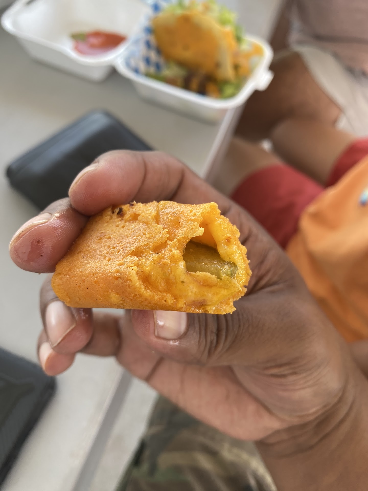 We loved our dinner at Katie's! My daughter and I shared a few things: chickles with the jalapeño ranch - amazing, so good! Ground beef burrito was our favorite - it was perfect! We also had what I think was called The Chad - three tacos with grilled cheese on the outside, yes we love cheese! We had two chicken and one pork - they were delicious! We forgot to say no cilantro on those but did remember to say it on the burrito so maybe that's why we like the burrito more as we are "cilantro is soap" people. That was our fault, not theirs. We would have gone back for another meal but this was our last night. Outdoor seating had a great view but it was nice to have the option to eat in the community center if someone wanted to, and to use their restroom facilities.