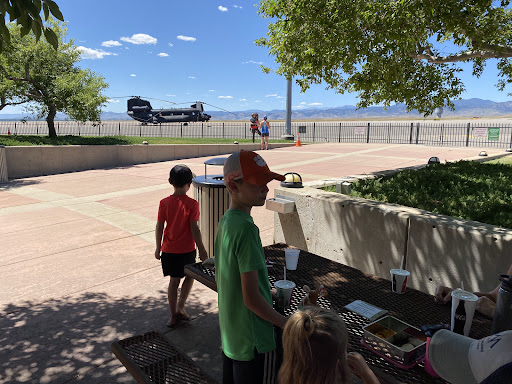 Don’t miss out on the huge, tree-shaded patio here! Super kid/dog friendly and amazing view of take offs with the mountains in the distance. Corn hole and plenty of space for the kiddos to relieve the zooms.