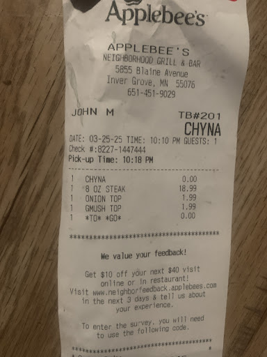Read moreMy little brother says this Applebee's in specific has his favorite chicken wings ever lol. However my personal fave is Applebee's classic cheeseburgers & French fries! However I was a bit let down with my order from here, I ordered my favorite meal, obviously. & not only was the burger not cooked the way I asked for it to be (medium well) but it was under cooked which is never a good thing. I took one bite & unfortunately spit it out due to how pink it was still.. the fries were UNSEASONED (the seasoning on the fries is literally why i love them so much.) and were cold and slightly soggy...? I've eaten here over a year before this experience and back then I had a wonderful time, but this time at least as far as the actual food went was not a good time at all. But i will say the host that bagged and rang up my order was very kind. I enjoyed speaking with her. the only other thing Id like to say is there really should to be more standing room for customers when waiting for a table, paying for their meals, etc. The area they currently have I personally don't think is even big enough for 2 full booths. For instance i am 5ft tall and i was attempting to stand there with 3 other men, all whom were about average height/ maybe slightly shorter and to be completely honest it was so cramped that we were all touching shoulders... just made it very uncomfortable overall while waiting for my food/waiting to pay. Overall though this specific Applebee's franchise is alright. I just know of a few other locations that I...