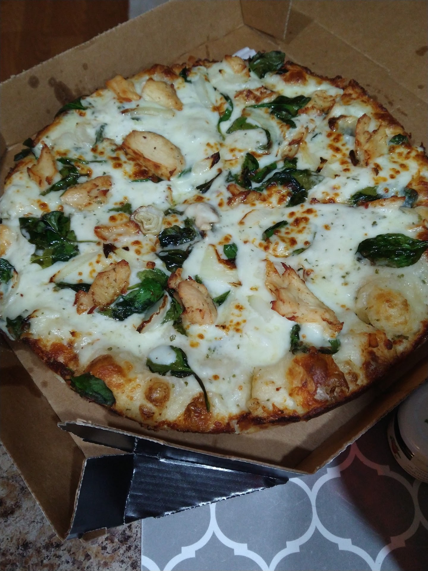If you're looking for some great pizza and would like to try something a little different than your typical pizza pie with red sauce and mozzarella cheese and assorted toppings, I suggest trying the hand tossed pizza with garlic parmesan (white) sauce instead of red/marinara sauce. I personally add the premium chicken and spinach (sometimes I order my pizza with spinach, sometimes without depending on my mood) toppings.