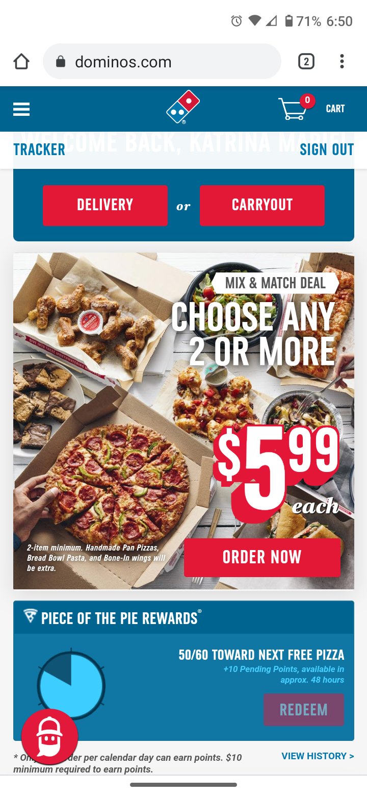 Now I can't get enough of Domino's Pizza. I use the online website to place my orders as I have a rewards account with them which does pay off from time to time certainly with free pizzas and other deals. I do take issue with the speed of the website as it can be frustratingly slow. But I try to just deal with it and put the phone down come back a few minutes later and whatever screen I'm trying to complete well then be loaded. But, overall, it certainly worth that little frustration to have a hot, very very delicious pizza delivered to me in a very short amount...