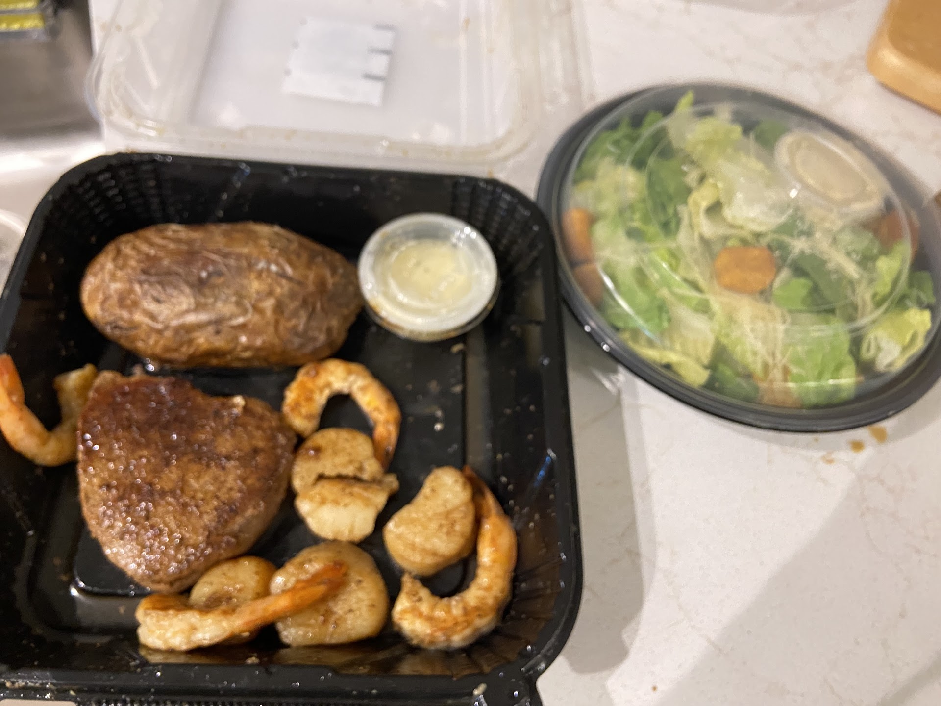 I witnessed a virtual light bulb go off over Sherry's head, as she pointed out an item on the special 'Specials' menu. And there, in bold colors, was the answer to my Outback comeback! I could get a Steak 'N Mate Combo! I'd get my Outback Sirloin paired with Bloomin' Fried SHRIMP! Imagine the taste of a Bloomin' Onion but wrapped around succulent shrimp! Shrimp swimming in that spicy bloom sauce. AND this came with TWO sides! Craving completely satisfied! Pinch me! Naturally, I got a loaded Baked Potato and a take-me-back House Salad.