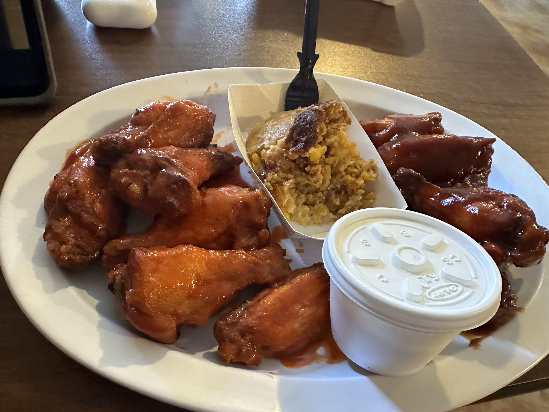 I came into this restaurant with very little expectation, left pleasantly surprised and satisfied. I stopped here because it was the closest restaurant with a decent rating after eating here. If I’m out in this area again, I’ll probably stop again. I know it’s a barbecue place but hands-down that Memphis Burger was one of the most delicious burgers I’ve had in a long time the abundance of onion and sauce dripping out the side was amazing bacon that sticks out on either side by about 2 inches. The sauce was slathered all over it. The burger was very soft, moist, but sturdy, the burger alone would get them a five star. Customer service was amazing. They had suggestions and recommendations on everything that they had even the cook was given me choices recommendations, the wings tasted, smoky, and was soft, the sauce on the wings was generic for the mild, but for the barbecue sauce that was their own sauce, and it was pretty good all in all for the wings I would give four stars for price plus taste now onto the sides. I got the cowboy potatoes and the corn casserole. Both of these sides was absolutely delicious if I had to pick the winner, it would be the corn casserole definitely worth trying if you’ve never had either one of these they were made real well had tons of flavor and was real soft. Both sides would get a five stars in my book. Customer service was amazing five stars They checked on me multiple times to see if I was ok and if the food was good. All in all I know this is a pretty long one so Long story short Absolutely delicious great customer service 100%...