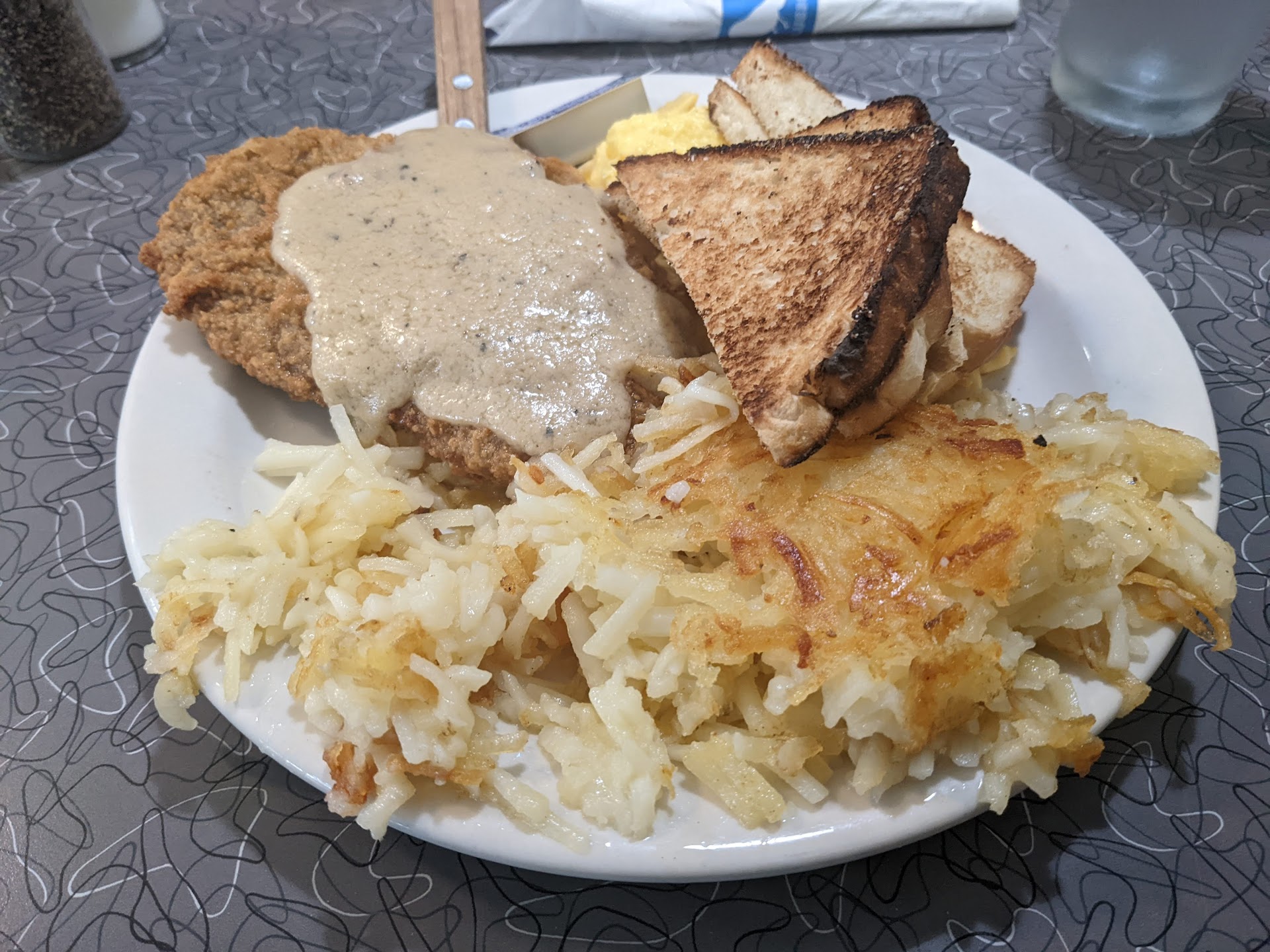 Been here twice with an excellent experience both times. Sunday morning, January 26 my wife and I arrived early with only several people at tables. We chose a table and a somewhat bland young woman brought us water and menus. She came back and took our orders and a couple of minutes later brought our coffee. Our food arrived and we proceeded to eat. Now please understand, we were here because we loved our previous visits here. I had ordered the fried chicken steak but received beef instead which was ok since I had considered both. I thought that I was getting hash “browns” but there was very little brown, just a pile of string potato that was at least hot but barely any crisp brown crust. The scrambled egg had been poured on the griddle and turned once, more of an omelet, rubbery and chewy. My toast was a 3/4” thick slice of bread that spent enough time in the toaster to melt the butter, but had no toasted color other than white to match the potatoes and was more like bread than toast. The beef gravy over the fried steak was very good, the best part of the meal, but there was not enough of it, it would have been nice to be able to spoon some over the potatoes. My wife had the same potato issue but had ordered a pancake in lieu of toast. The pancake looked beautiful when served, but the ball of butter never melted even a bit, but cold is ok since that was to be her desert. Her first two bites off of the edge of the pancake were consumed, but when she looked at her cuts into the pancake, raw batter was oozing out of the inside of the cake, not edible at all and the meal was spoiled completely. Oh, I forgot to mention that after the server presented our plates, she never came back to check on us and midway through my meal I had to walk up to the server station for more coffee as she never came back to see if we needed more coffee. So while the food here has always been very good to excellent, we definitely had a bad experience this visit. Wait staff needs training or this young lady needs to find another profession and ditto the cook. I fault the management for lack of training and oversight. But we did get one dollar off the bill. Not...