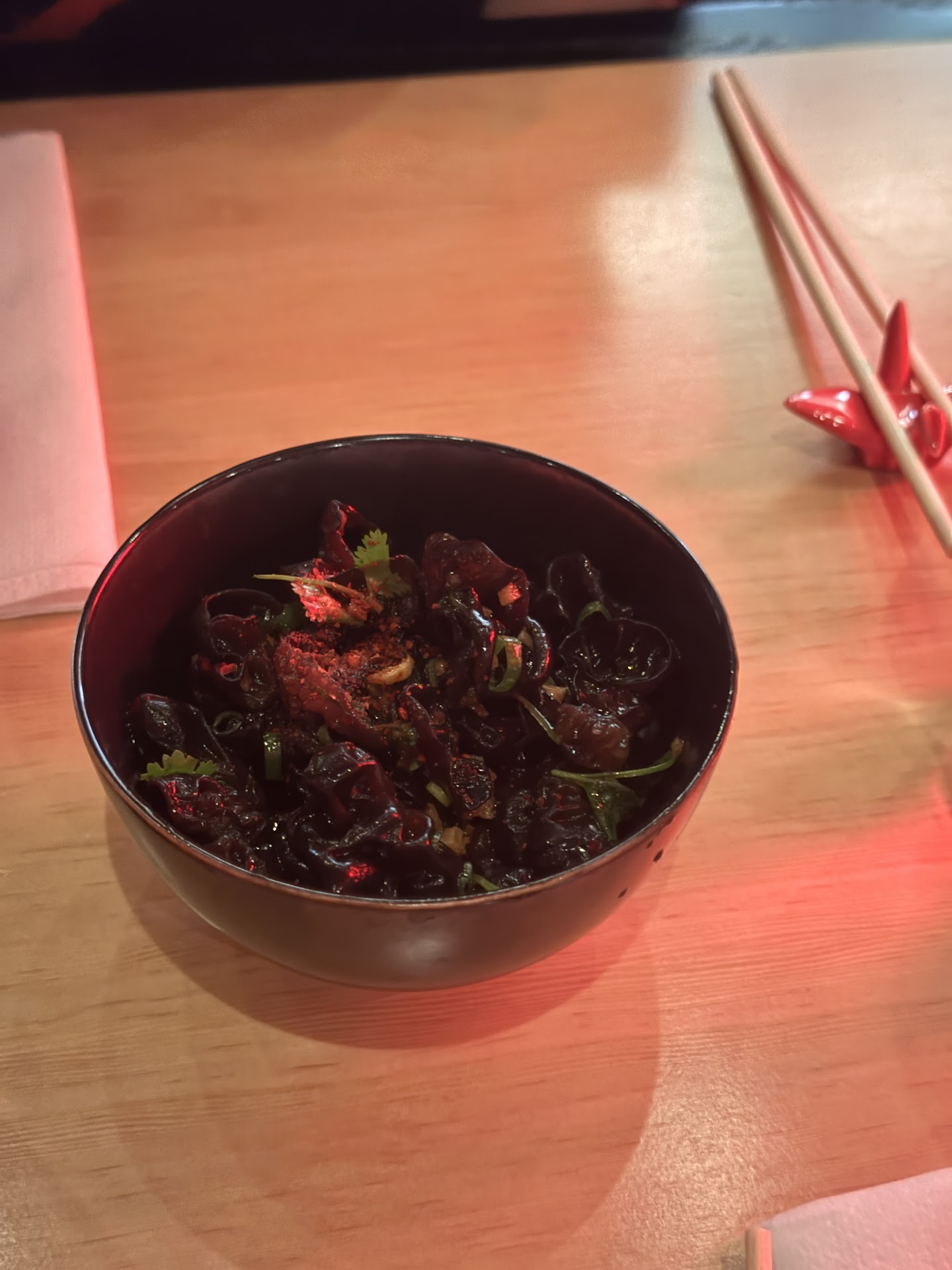 THE STRANGE: The spoons were big and ceramic and thus quite heavy; it certainly felt luxurious but was quite impractical to use. The napkins were also very thick, which was nice. However, it felt weird to use a fancy spoon and napkin with disposable wooden chopsticks. I know they’re going for a “casual ramen shop" vibe, but this place is already upscale enough that single-use chopsticks feel like a weird hill to die on. I especially felt this when I rested them on the beautiful paper crane chopstick rest.