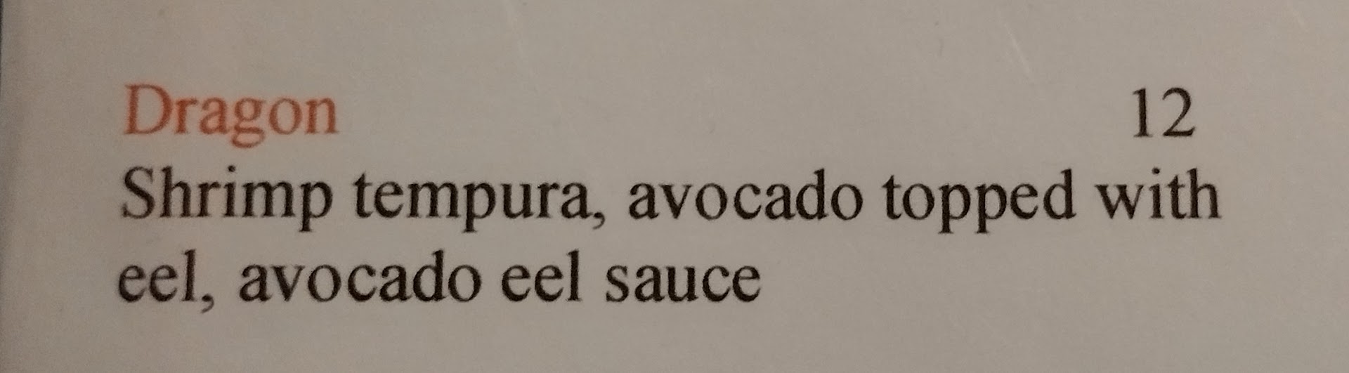 Dragon Roll: this is a hot deep fried roll, it was good, tho I should have ordered something with more sashimi as I'm big on the quality of raw fish. 4 out of 5.