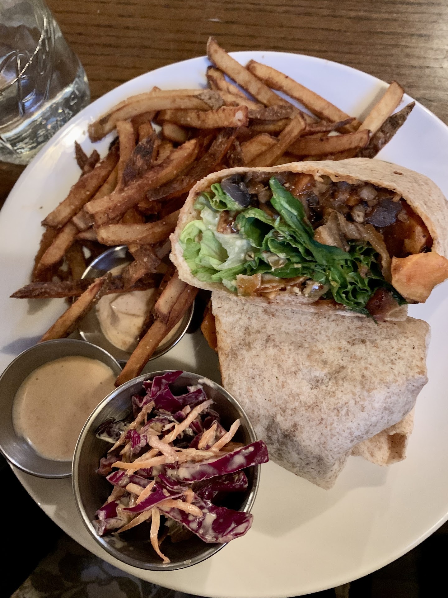 Read moreThis is a nice little vegan restaurant in the heart of Iowa city near the University of Iowa. This restaurant has fully vegan menu with a very good variety of appetizers entrees and desserts combined with a great selection of beers wines non alcoholic beverages and cocktails. We ordered a couple of draft beers and a non alcoholic beverage named Trumpet blossom chill. For appetizers we ordered the heat of palm crab cakes with a tangy mustard based aioli. For mains we ordered the Falafel burger, with sides of sweet potato fries and tomato soup with corn bread, spicy coconut milk Thai curry, cold noodles. I really loved the crab cakes, falafel burger and the corn bread. The soup was a hearty tomato soup with a hint of basil and oregano. The sweet potato fries that accompanied the burger were really crispy on the outside and chewy inside and were accompanied with really good dipping sauces. The draft beers and the trumpet blossom Chill were really good as well. The trumpet blossom chill had a really nice floral note from the rose and a nice underlying bitterness from the coffee. Overall it was a really good...