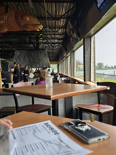 Bobby Mac's is on the water. In my view, that is a feather in anybody's cap. You cannot go wrong with the water at your side. Their views inside were also very nice. Ample windows to take in the breathtaking views, and ample seating to enjoy them. As I walked in, I noticed the bar to the right, with a cash register near by on the counter. The seating ahead and to the left. The lady I thought was the bartender, later seemed to be just another waitress. At least at lunch time they didn't have a designated bartender. This I didn't really notice until later when I actually ordered a drink. I sat in a booth, one over from the window booth, but still had an excellent view. The problem I had with the ambiance was the volume. Because it was a room lacking ceiling tiles, drapes, or other tapestries, there was no place for sound to be absorbed. The televisions were not loud, and the place not crowded at all, yet sitting across from my mother, I had to ask her several times to repeat herself, and her me, because of the din. The wait staff was very pleasant, attentive, and friendly. When I did order a daiquiri, and was informed it was a mix, I requested a specific drink mixed. When it came out it was tasty, but based on what I ordered, there volume I received, and the taste, I don't think they got it correct. However, like I said, it was tasty. I ordered the oven baked whitefish, with rice and coleslaw. The coleslaw had a nice consistency; being not too creamy, nor too vinegary, but it was lacking something in flavor. I like cabbage, so I did enjoy it, but it was lacking a zing... Garlic, Dijon, vinegar... Not sure. The fish and rice were served in good time, came out as a pleasant plate presentation, and was delightful. Compliments to the chef! The prices were also reasonable, and as I have said, the wait staff, very polite and friendly. Honestly, if it wasn't for the sound problem, I would have given this five stars, based on what it is, and what it serves. And that's how I rate these places; based upon what they offer, and how it's presented and tastes. I'd go back again, though I hope they do something about their acoustics in...