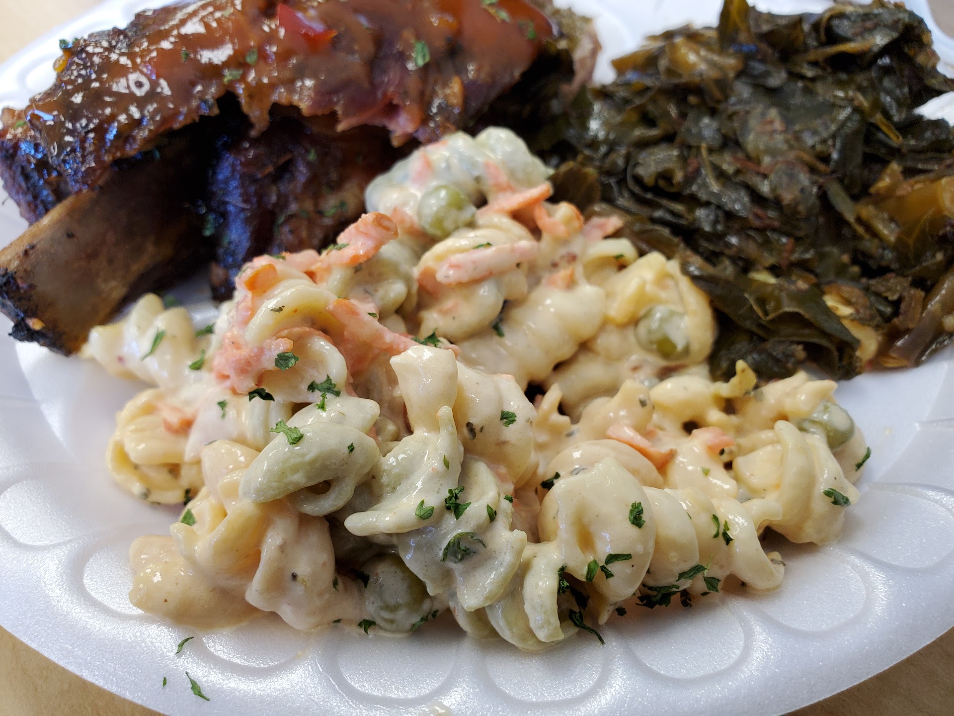 For just under $11.00 I got three bones (pork ribs), collard greens, and pasta salad. The ribs were meaty and tender. They have three or four different flavors. I got sweet and spicy. They were only mildly spicy. In fairness, it should be noted they were prepared yesterday. At this price point, this is an acceptable trade for me.