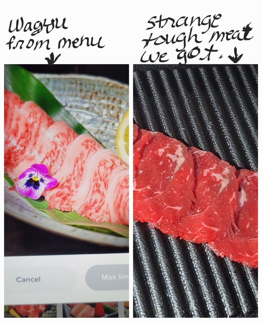 They limit you one order per person on the better cuts and sushi. This is kinda ridiculous since we paid a much higher price to eat their top tier choices. We can go eat at other Japanese bbq without limits for the same price or cheaper closer to home. We can also go eat at our favorite sushi spot with no limits and the price is about the same even though it's mot AYCE.