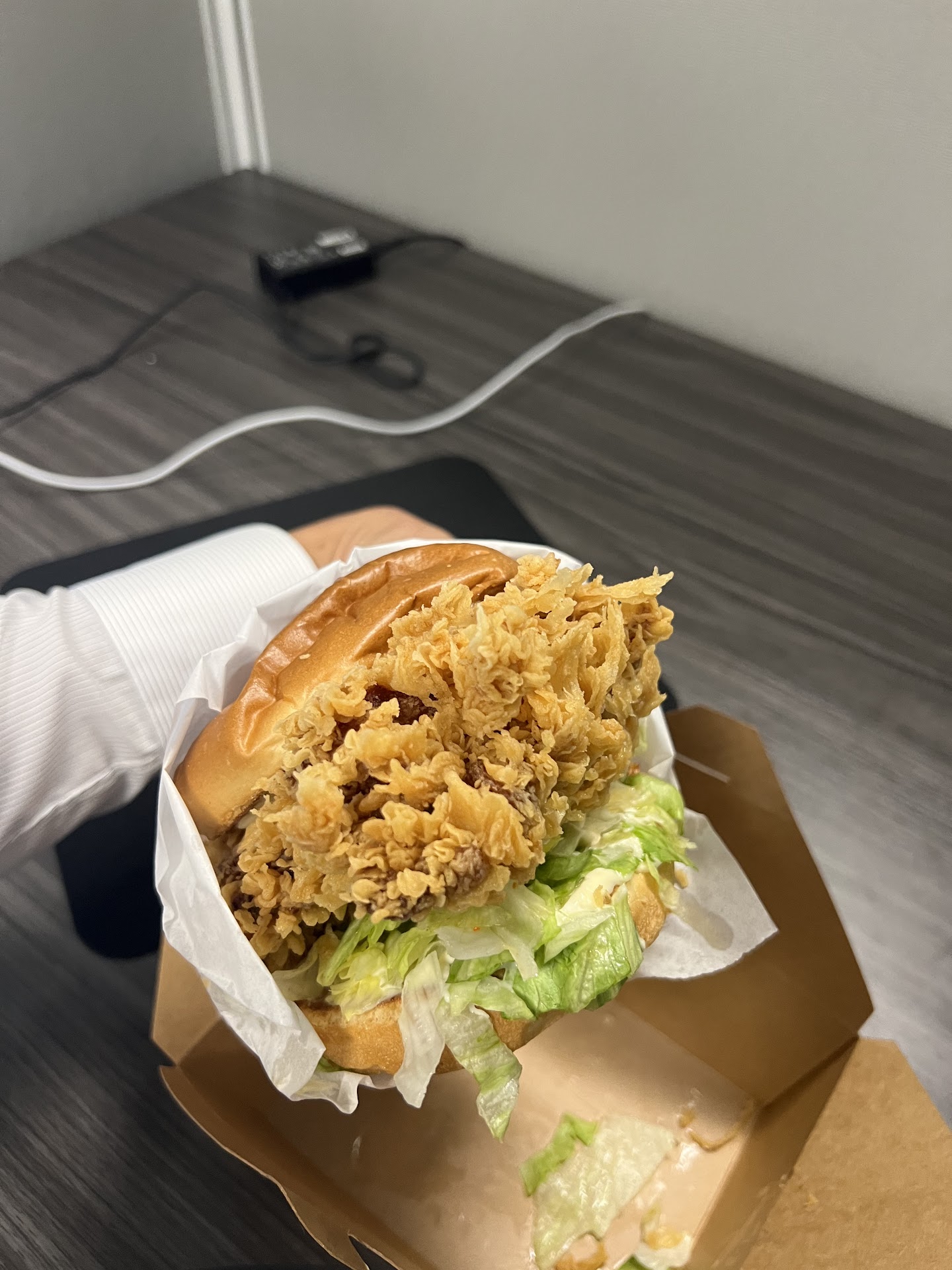The chicken breast in my sandwich was huge and did not expect it to be that big. I'm used to getting tiny chicken breast pieces so this was a great surprise. The breading was nice and crunchy, and the ingredients in the sandwich worked perfectly along with the mayo sauce they provided on the side. You get to choose between a breast or a thigh. The chicken sandwich was larger than an average chicken sandwich. It was not greasy, the chicken itself was nicely cooked and flavorful. It was one of the best-tasting chicken breast sandwiches I've had this far. 5/5