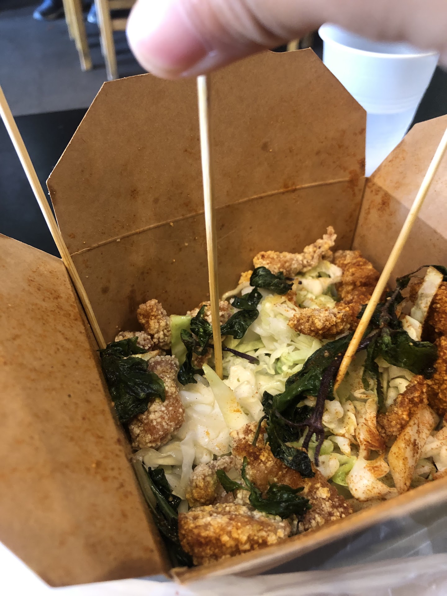 This would be a great place to go if you wanted lots of cabbageā¦except we wanted popcorn chicken. We were shocked to discover that our box of popcorn chicken was heavily padded by a thick layer of cabbageāit took up at least 1/3 to 1/2 of the box.