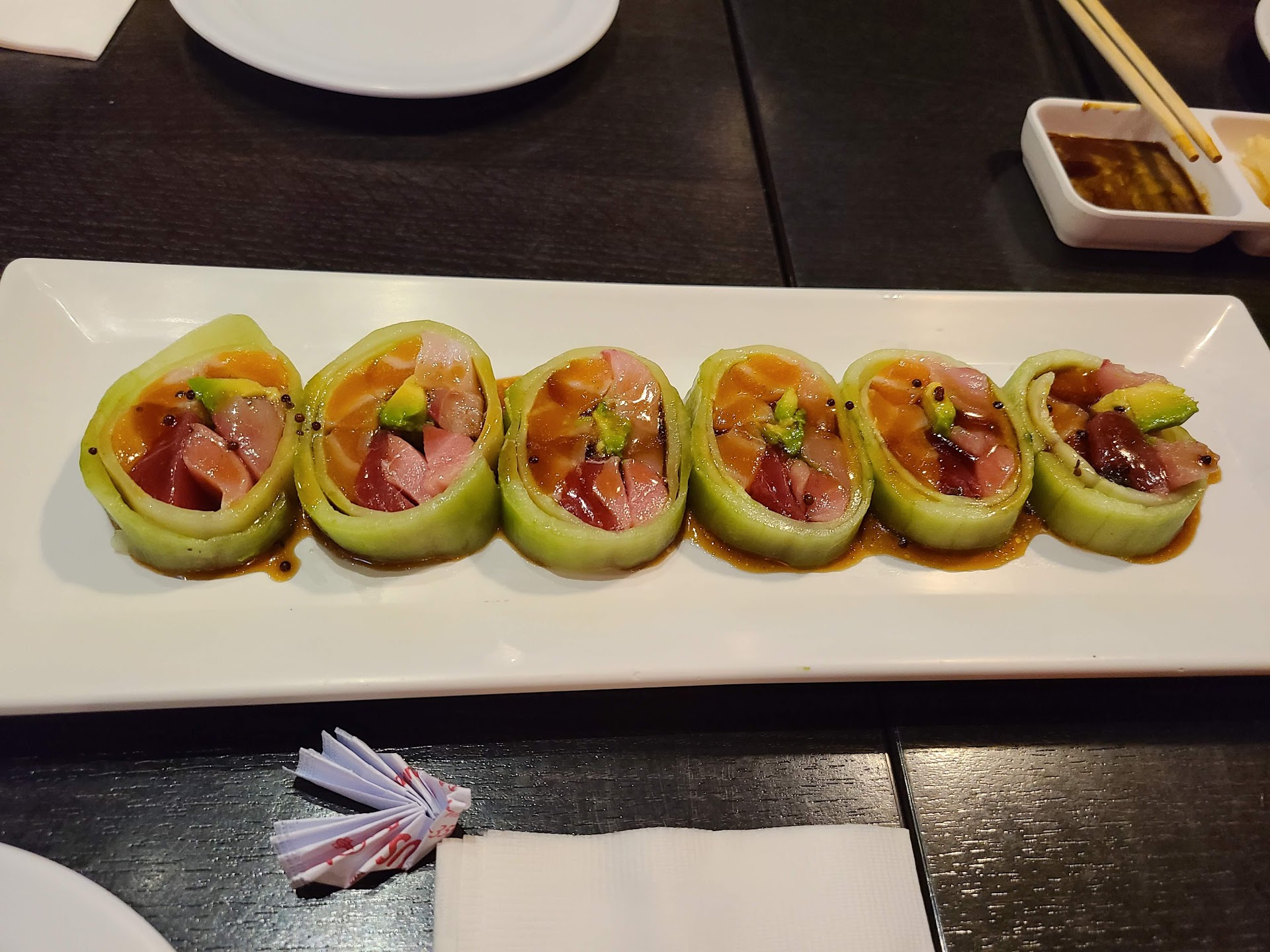 Disgusting ambience & our waitress was very poor. We ordered everything clearly on the paper order sheet including the Tempura green beans & she brought us the plain garlic green beans instead. We ordered a chicken salad, it never even came! We ordered one specific crab plate & a different plate with crab came, we returned it & finally got the correct crab plate. Mind you it was clearly on the order form! She would hardly come by our table & if she did she altogether avoided eye contact with any of the 4 of us. As she brought another apparent "special friend" party to a table (right past our table) she was holding the hand of a young woman in that party all the way from the front of the restaurant toward the back of the restaurant behind us. We could not get her attention either direction. Also important was how disgusting they kept their work area adjacent to our table, there was a heaping full trashcan, along with a dirty napkin, a used plastic white spoon (why it's cut out of the bottom of the pic near the trash can I don't know) and smashed food on the floor in plain sight to multiple adjacent dining tables. Revolting! My nephew, who led us there was quite embarrassed saying he'd really known the manager well in the past & didn't think a new manager would have such a big disappointing impact. Wow, this whole deal makes me really wonder about the quality of the sashimi which can be a real serious health hazard! However......the...