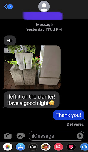 A. Answered the phone 1 minute to closing B. Listened to me explain my “situation” C. Disregarded the fact that they had no obligation whatsoever to serve me because they hadn’t received an order via postmates in my name D. Served me anyways. After closing. Even though I wouldn’t get there for another 20 minutes to pick it up E. Said it was on the house F. Kindly left my sealed order sitting neatly atop a flower pot just outside the store entrance, and followed up with a text containing a picture of where to find it.