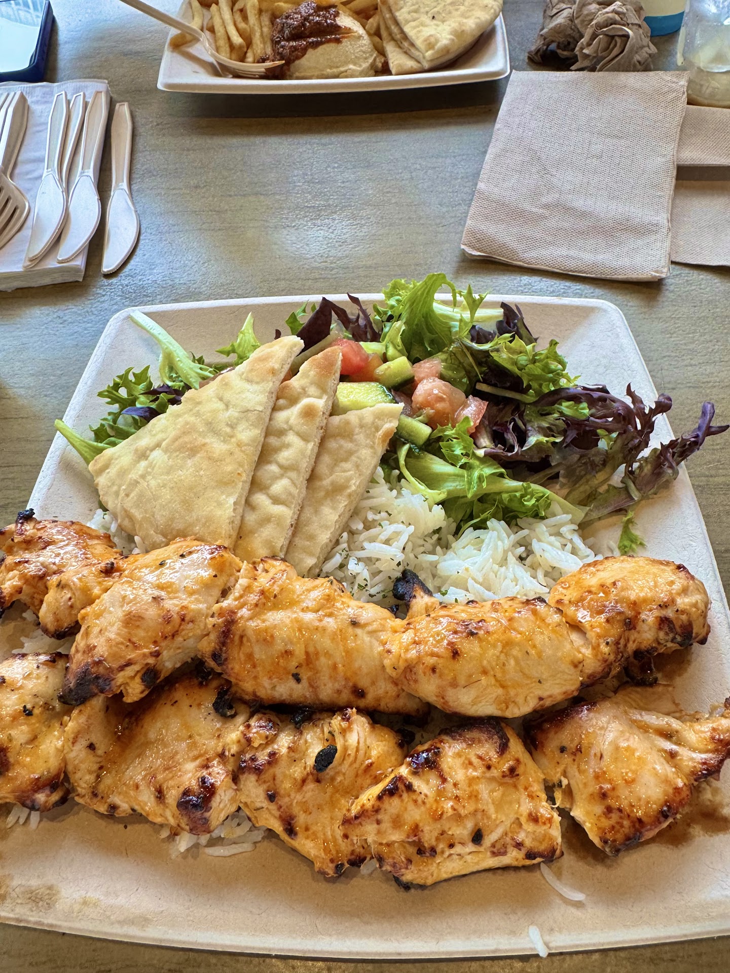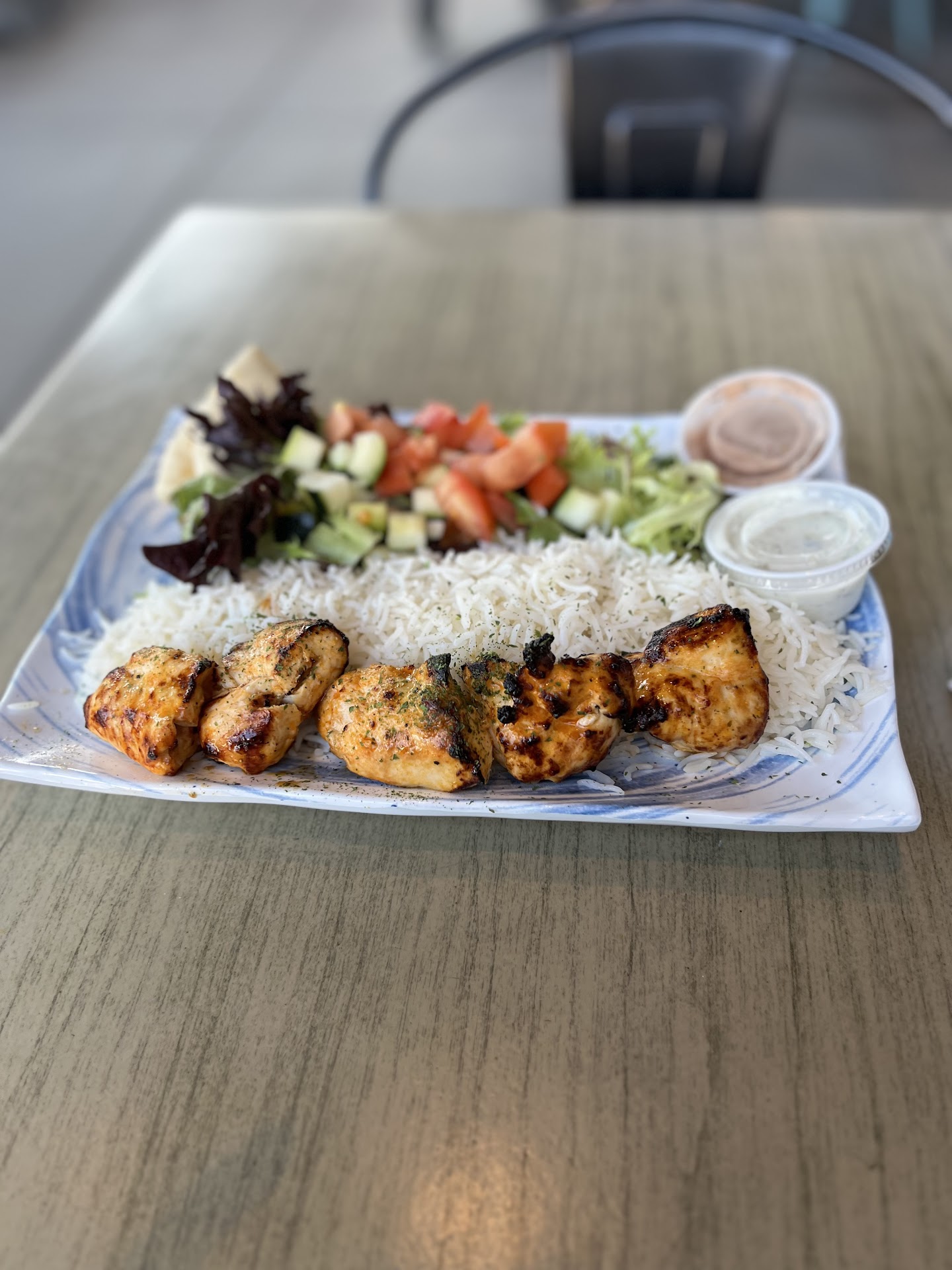 I always get the Gyro plate. I sometimes add a chicken and/or beef kabob to make it a dinner or lunch for 2. I love the salad, pita, and rice that comes with the combo. I dine in if there is space or take it To Go and eat outside.