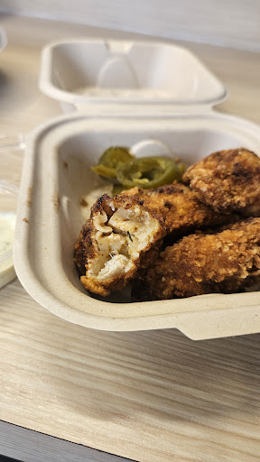 We got the mac and cheese dumplings, the very vegan dumplings, the waffle fries, and the oreo cheesecake dumplings. Everything was delicious. The food came fast, so we had plenty of time to eat between our classes. The mac and cheese dumplings were delicious not too cheesy. The vegan dumplings tasted pretty normal, as you would expect. The waffle fries were a bit pricey, but we got a very large quantity and they were delicious. Both the mac and cheese dumplings and waffle fries came with a special aioli sauce that complimented them well. The oreo cheesecake dumplings tasted unique, very good, but not something I would always be in the mood for. I recommend you try them out though!
