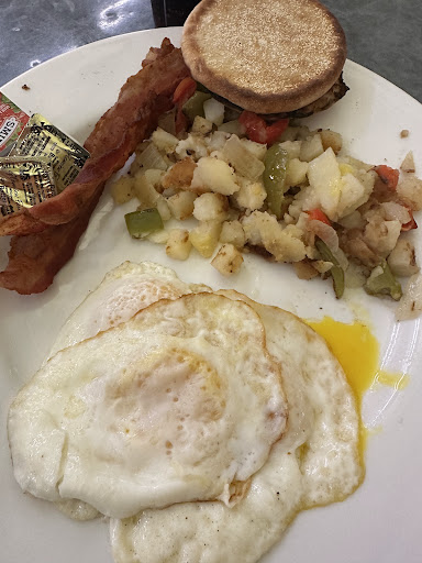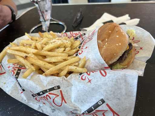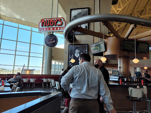 Read moreFirst we waited near the bar and the next door take away deli at the sign that said please wait to be seated, after a few min we were told that the hostess was on the other side of the bar in the restaurant; so we walked there to be told 5-10 min wait. We had 45 min prior to boarding and from previous reviews we were hopeful we could get fed, pay and able to board in that time. We made it in about 45 min after having to track our waiter down twice to pay. I ordered the ruby burger with cheese and garlic fries and husband got the chicken tenders app with the three sauces. All of it was okay, nothing special not that it is necessarily expected in airport diner style food. Staff was busy-ish but also spent a lot of time chit chattin at the order input/pay station which I felt impacted the unnecessary delays and it's out in the open so everyone can see that there is a bit of gossip happening :/